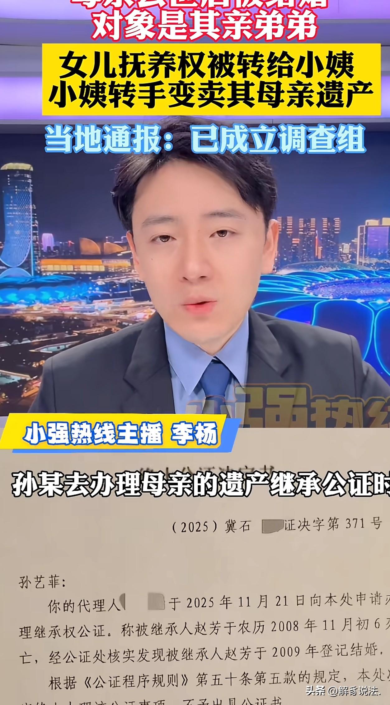 “电视剧都不敢这么演!”河南,女子的父母早年离婚,她和母亲生活。在她9岁的时候,母亲去世,母亲给她留下珠宝商铺,几套房产等巨额遗产。随后,她的抚养权变更到其小姨名下,她和小姨生活。17年后,她去办理遗产继承公证,却被告知其母亲在去世后第二年就办理了结婚登记,女子不能办理财产继承。女子差点没惊掉下巴,赶紧调查这到底是怎么回事?结果发现母亲结婚对象竟是自己的亲舅舅。女子还发现,其小姨在母亲去世的第14天,就暗中变卖其母亲的房产。女子知道真相后,愤怒至极,仅用一招,势必拿回属于自己的一切。网友惊呼:这是真正的要吃绝户! 赵芳早年和丈夫离了婚,一个人带着女儿孙某生活。 婚姻不顺利,她就把所有心思都放在事业上,也算给自己和孩子挣足了安全感。 她是个典型的事业型女人,脑子灵活、能拼能干,靠着自己一路打拼,给女儿攒下了殷实的家底,名下有珠宝商铺、好几套房产,本想给女儿一个稳稳的未来。 可天有不测风云,2008年12月3日,赵芳突然因病去世,彼时,孙某才只有9岁,还是个什么都不懂的孩子。 更让人觉得不对劲的是,赵芳走后,既没有按规定火化,也没有开正规的死亡证明,户口更是一直没注销,一切都透着诡异。 年仅9岁的孙某,抚养权莫名其妙就转到了小姨名下。 从那以后,她就跟着小姨生活,可小姨却一直拦着,不让她见亲生父亲。 小小年纪的孙某无力反抗,只能把对父亲的想念默默藏在心里。 时间一晃到了2025年,孙某已经26岁,她知道,母亲留下的那些房产、商铺,是妈妈辛辛苦苦一辈子给她挣的,她必须拿回来。 于是她去办理遗产继承公证,想拿回属于自己的财产。 可公证员的一句话,直接把她砸懵了:你母亲赵芳2009年,也就是去世第二年,有结婚登记记录,你不是唯一的子女,没法直接继承。 孙某当场就傻了,母亲都入土这么多年,怎么可能死后再婚? 她四处去查,结果越查越心寒,越查越绝望。 母亲结婚登记的对象,竟然是她的亲舅舅,赵芳的亲弟弟! 可结婚证上的女人根本不是赵芳,而是舅妈;就连后来开的死亡注销证明,照片也被换成了舅妈的。 更离谱的是,母亲去世后户口不仅没销,还被人从石家庄违规迁到了河南平顶山鲁山县。 明眼人都能看出来,这就是一场精心设计的骗局:用舅妈的脸顶赵芳的身份,跟亲舅舅登记结婚,伪造出赵芳再婚生子的假象,就是为了抢走孙某的继承权,霸占母亲的全部遗产。 同时,孙某还查到,母亲去世仅仅14天,就有人拿着伪造的委托书,以赵芳的名义把石家庄的房子卖掉,卖房的钱一分没花在她身上,全被小姨拿走了。 在那之后,珠宝、商铺等资产也被一点点掏空,最后只剩下一个空壳。 知道真相的孙某彻底崩溃了。 她终于明白,小姨为什么这么多年一直拦着她见父亲,原来最亲近的亲人,一直在盯着母亲的遗产,算计她! 失望、愤怒、委屈涌上心头,孙某含泪把这件事发到网上,撕破脸曝光了小姨和舅舅的所作所为。 这件事很快在网上炸了锅,舆论哗然,也引起了相关部门的高度重视,目前多个部门已经成立联合调查组,对这起荒诞又恶劣的事件全面彻查,一定会给孙某一个公道。 此事曝光后,网友们愤怒不已: 道义放两旁利字摆中间,这真是为了利益什么事都能干得出来呀,简直就是神操作! 死亡人员的户籍为何能随意迁移?冒用身份为何能顺利完成婚姻登记?多个环节的漏洞,真相到底是怎样的? 《民法典》第1151条规定:存有遗产的人,应当妥善保管遗产,任何组织或者个人不得侵吞或者争抢。 小姨、舅舅以伪造身份、虚假婚姻、擅自出售房产等方式,非法侵占本属于孙某的遗产,已明显违反本条规定。 孙某有权通过法律途径要求返还财产、赔偿损失;若情节严重、数额巨大,相关人员还可能涉嫌刑事犯罪,依法承担刑事责任。