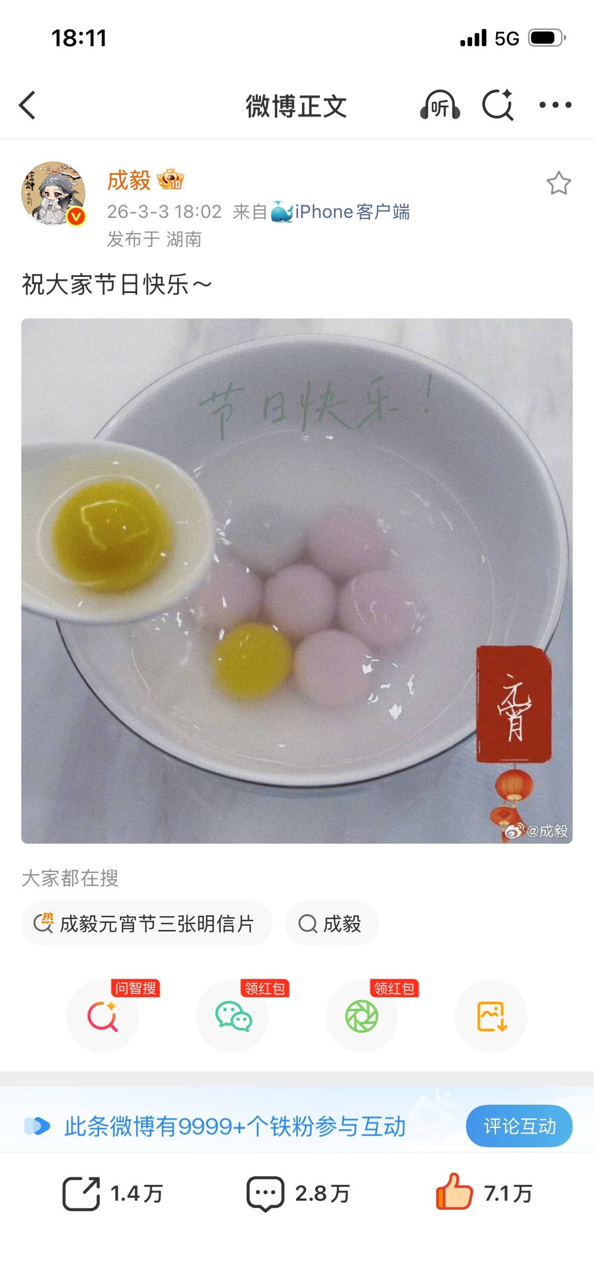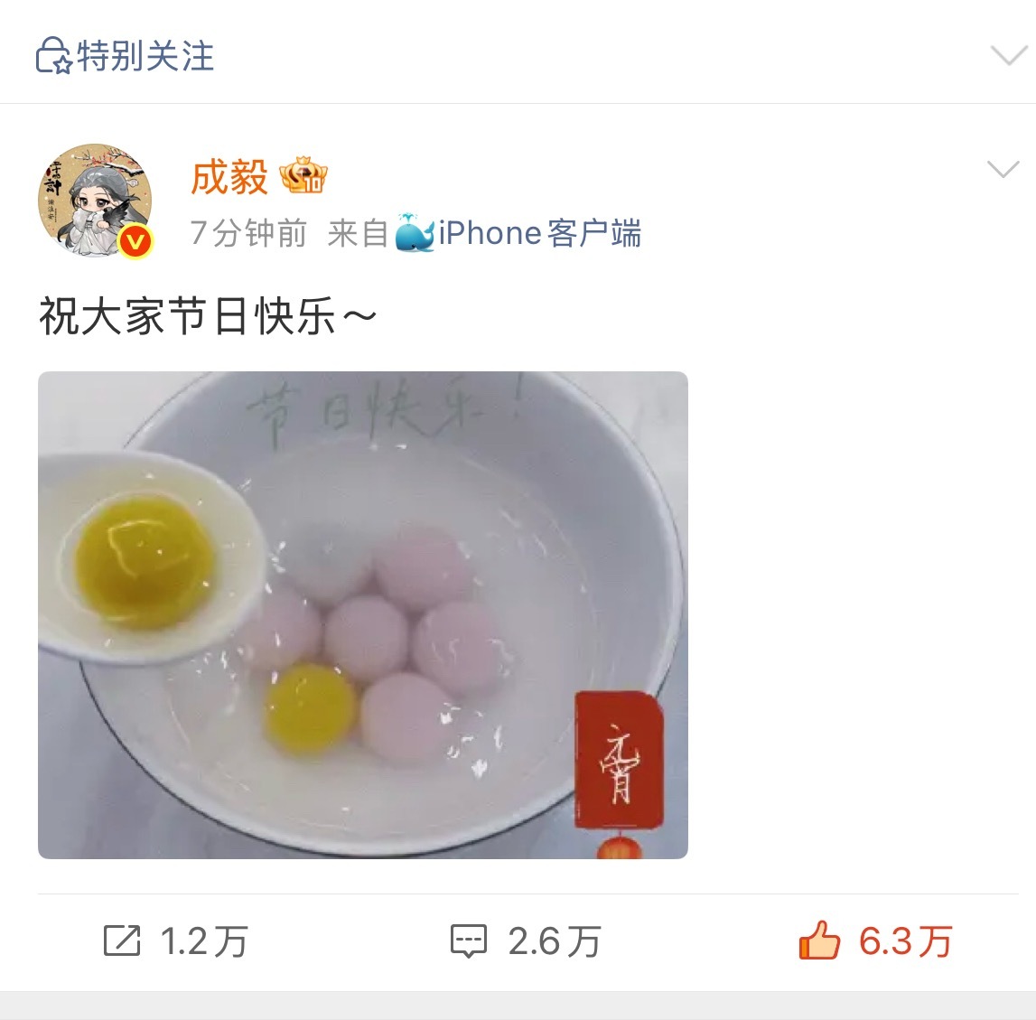 成毅祝大家节日快乐!汤圆是两(黄汤圆)京十(白汤圆)五(粉汤圆)日!寓意太好了,