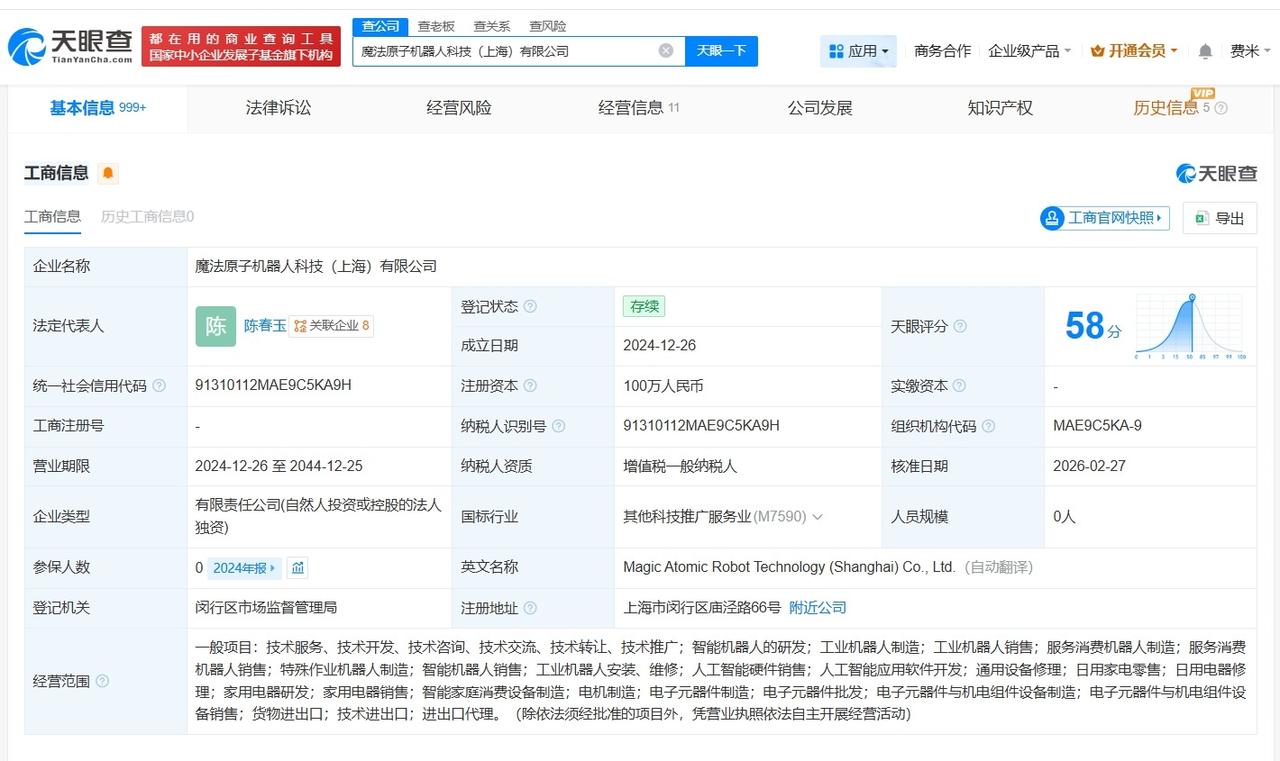 魔法原子创始人退出旗下多家公司 魔法原子创始人卸任旗下多家公司职务 天眼查工商信息显示,近日,魔法原子机器人科技(苏州)有限公司发生工商变更,魔法原子创始人吴长征卸任法定代表人、董事,由陈春玉接任。 魔法原子机器人科技(苏州)有限公司成立于2024年12月,注册资本1亿人民币,经营范围包括智能机器人的研发、工业机器人制造、服务消费机器人制造等。股东信息显示,该公司由魔法原子机器人关联公司魔法原子机器人科技(无锡)有限公司全资持股。值得一提的是,近期,吴长征还卸任了魔法工场机器人科技(北京)有限公司、魔法原子机器人科技(上海)有限公司的法定代表人。 天眼查信息: