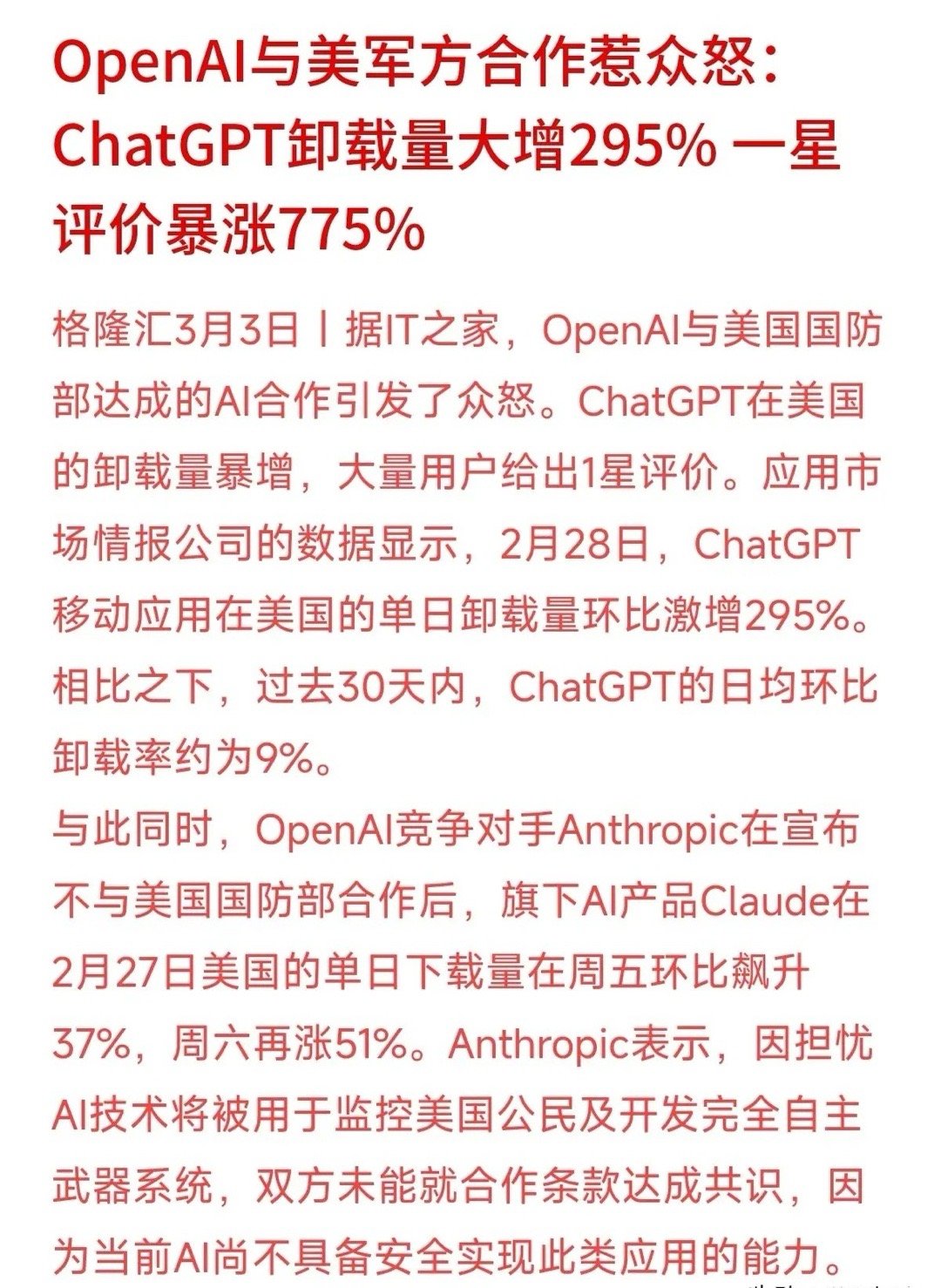 科技无国界?这就是本世纪最大的笑话!OpenAI与美国国防部达成合作,引发美国网民大恐慌!ChatGPT单日卸载量暴增295%,被骂出775%的一星差评!