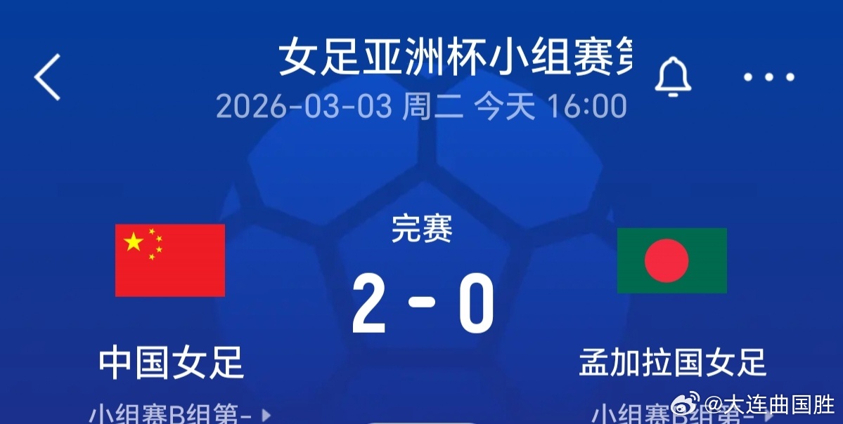 中国女足开门红中国队2比0胜孟加拉国队在女足亚洲杯 上中国女足有惊无险的拿下孟加拉女足,现在看来男足孱弱,女足也在坠落或许是危言耸听?但看这拨女足的表现但我还是怀念原来的女足,尤其是毕妍(微博找不到了)马晓旭,庞丰月还有那一帮子,现在大连的基本看不到了?这个王霜好像在大连待过,也十多年了吧?⚽️ 大连
