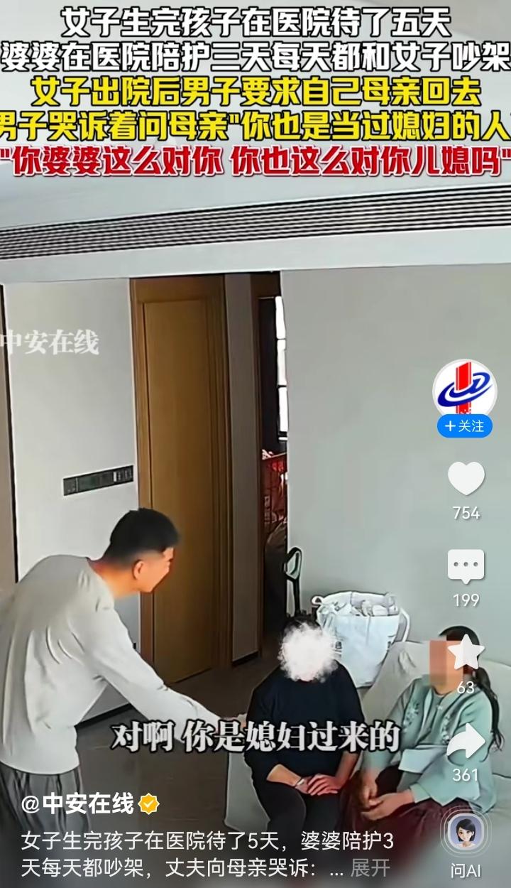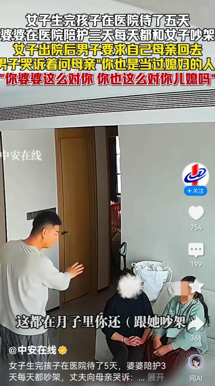 “这种男人嫁对了!”女子生完孩子在医院呆了5天,婆婆陪护3天,天天吵架。没想到,女子老公直接哭诉质问母亲:你也是当过儿媳妇的人!网友:嫁给这样的老公值了! 一女子生完孩子需要人照顾,于是婆婆就前来医院进行陪护。本以为婆婆的到来会给她减轻点看娃的压力,但没想到,反而是“灾难”的开始。 因为婆婆来的这3天,是一点也没闲着,天天跟女子吵架。本身女子刚生产完,身体和心理都急需调整和休养,可每天婆婆的争吵扰的她身心俱惫几乎崩溃。 终于,女子老公忍不住了。他直接来到母亲面前说:“我现在什么话也不想跟你说。”一句话没说完,男子就带着哭腔声音哽咽了。 而随后,男子的一番话更是让人感慨。男子说:“你也是当过儿媳妇的人,也是从儿媳妇过来的,你婆婆当年这么对你,你也这么对你儿媳妇吗?!” 男子的意思很明确:你当过儿媳妇,知道儿媳妇的各种委屈各种为难,尤其是刚生完孩子的特殊阶段,你为什么不能共情和理解到你现在儿媳妇的不容易呢?!你还天天跟她吵架! 母亲见儿子如此,就说了一句:我现在是暂时帮你们带孩子… 不过,不等母亲说完,男子就制止了她,并坚定的说:“其他的我不想跟你说,你就给我个准信儿,你是明天走还是后天走!” 说到这时,还在坐月子的女子走了出来。想必也是听到老公的哭诉,出来安慰一下老公的激动情绪。 女子走过来拉了老公的手一下,老公也紧紧的握住了她的手,随后老公就拉着她回屋了,不想让老婆和母亲同处在一个空间里。 可以看得出来,男子非常的心疼自己刚刚生完孩子的老婆,也很理解她遭受母亲的负面情绪的委屈和煎熬,所以才“挺身而出”让母亲走。 有人说,婆媳矛盾本来就是千年的难题,再说两人吵架也是一个巴掌,拍不响,不能只指责母亲!更何况那还是自己的亲妈。 不过,也有很多人说,重点是这个当儿子说的这番话,说明这个当母亲的就是以婆婆的“身份”在“教育”儿媳妇,他看不下去了,才如此。 也有的网友分享自己在月子里被婆婆气到回奶的事情。说婆婆名义上跟她睡一个屋,夜里帮忙照顾孩子,结果孩子都掉地上了,婆婆还在呼呼大睡,最后还倒打一耙说是自己白天看娃太累了。其实呢,白天基本都是儿媳妇在带娃。 还有的,没分享和婆婆的故事,就只说了一句话:月子里和婆婆的仇,不共戴天!甚至几年不来往的都大有人在! 其实,月子之仇,不共戴天,从来不是一句气话,而是无数月子里的妈妈藏在心底的委屈。 很多婆媳矛盾,不是生活习惯不合,而是共情缺位。 有些婆婆总是以“过来人”自居,总是说自己当年如何如何,自己儿子就是这样养大的。甚至,把自己当年不正确的育儿观念或方式方法都强制儿媳妇遵从照办。但她们却忘了,自己也曾是小心翼翼的儿媳。 有些婆婆就是总觉得儿媳妇娇气,却忘了刚生产的女人,身心都在悬崖边上。 有句话说的挺扎心的:亲妈是怕女儿再吃一遍自己的苦,而有些婆婆呢,却生怕儿媳没吃过自己受过的罪。 其实婆婆来照顾月子,不该是“监工”和“说教者”的身份,而是做一个搭把手的人。 婆婆少指责、多做事;少比较、多体谅;少翻旧账、多护着当下。而儿媳妇要的从来不是完美照顾,而是尊重、安静和心疼。 所以最好的婆媳关系,从来不是勉强亲如母女,而是彼此体谅、边界清晰。婆婆懂退让,儿媳知感恩,丈夫有担当,这样一个家才能真正温暖。 最后愿每一位刚经历生育的女性,都能被温柔以待,好好做好月子。 你月子里跟婆婆吵过架吗?你老公是怎么处理的?
