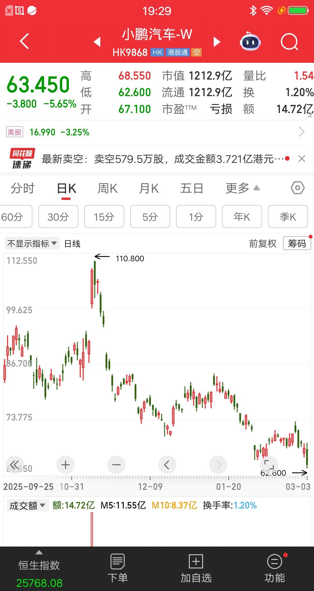 造车新势力的股价一个比一个惨,小米从高点61.45跌到31.58跌幅48.61%,小鹏从110.8跌到63.45跌幅42.73%,理想从128.1跌到6.55跌幅48.05%,零跑从76.3跌到38.26跌幅49.86%,触目惊心呀。 股价一旦经过大幅上涨,跌下来腰斩是标配。如果账户浮盈50%,股价高位腰斩,利润就没了。应该有不少投资者,目前就是这样。心里别提多难受了,煮熟的鸭子飞走了。 一般人投资可别学巴菲特,人家的智慧,定力还有本金,不是一般人能比的。普通散户要有波段的思维,涨多了抛一抛,手里有子弹,跌下来才能加仓。