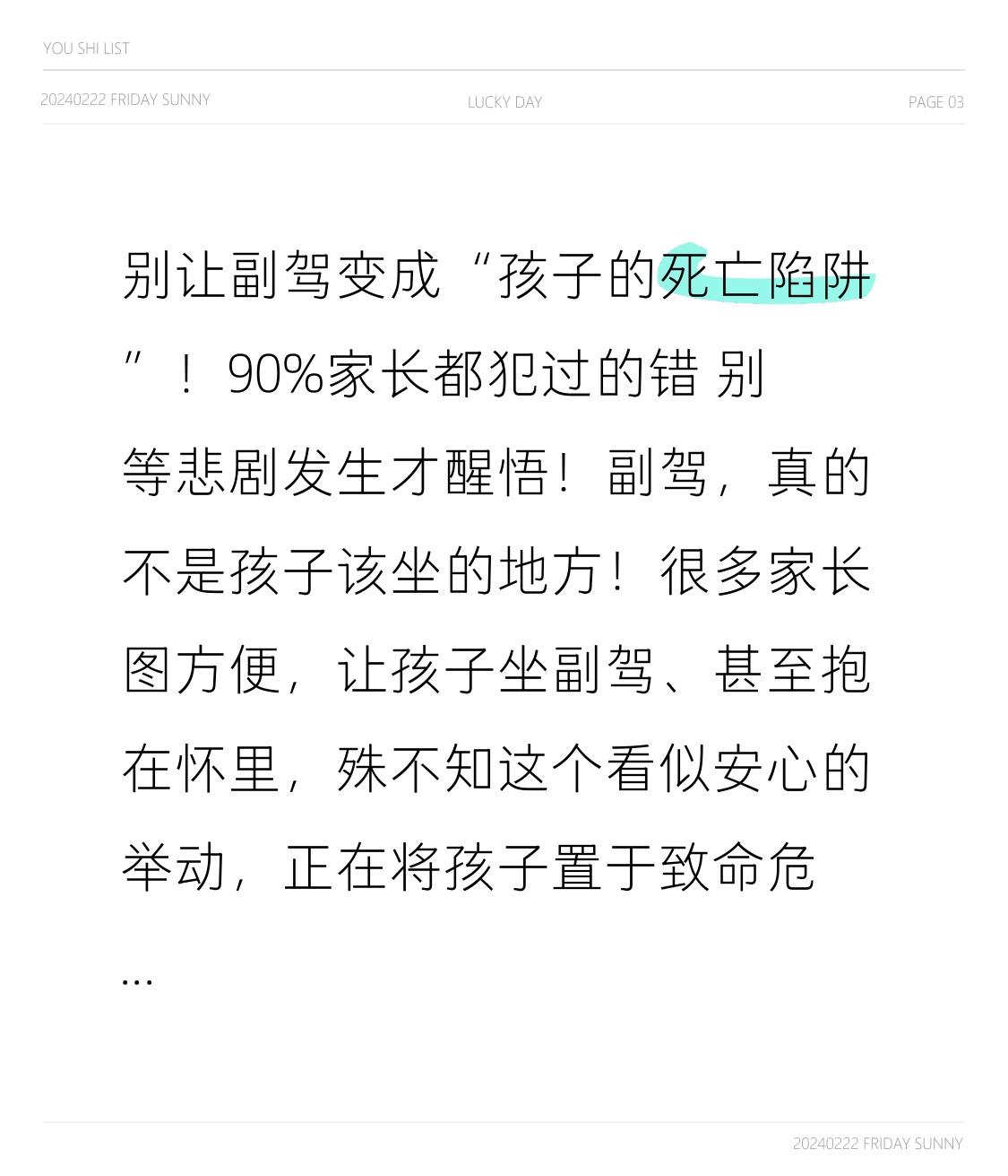 别让副驾变成“孩子的死亡陷阱”!90%家长都犯过的错 别等悲剧发生才醒悟!副驾,真的不是孩子该坐的地方!很多家长图方便,让孩子坐副驾、甚至抱在怀里,殊不知这个看似安心的举动,正在将孩子置于致命危险之中。 汽车安全气囊,是儿童乘车的第一大杀手。气囊弹出时速高达300公里,冲击力超180公斤,儿童骨骼柔软、头颈脆弱,气囊会直接击中头部与颈部,极易造成颅脑损伤、颈椎骨折,甚至当场死亡。实验证明,50km/h碰撞下,气囊对儿童的伤害,远超撞击本身。 成人安全带同样暗藏杀机。安全带是为身高1.4米以上成人设计,12岁以下孩子使用时,肩带会直接勒住脖颈,急刹或碰撞瞬间收紧,极易造成窒息、颈动脉受压,变成一条“夺命绳”。 更危险的是家长怀抱孩子。物理定律无法违背:50km/h碰撞时,10公斤孩子会产生300公斤惯性力,再强壮的父母也抱不住。孩子会瞬间飞出,撞击玻璃或被甩出车外,好动的孩子还可能误触车内开关,大幅提升事故风险。 权威数据显示:副驾儿童受伤风险是后排的3倍,未正确使用安全座椅的儿童,死亡率是规范使用的8倍。我国明确规定,12岁以下或身高不足1.4米儿童,严禁乘坐副驾,多地已立法严查,违规将罚款记分。 守护孩子安全,科学乘车是关键。0-4岁使用反向安装儿童安全座椅,4-12岁搭配增高垫,12岁且身高达标后,再考虑乘坐副驾并规范系好安全带。 孩子的成长只有一次,安全没有重来的机会。别让副驾成为伤害孩子的陷阱,把最安全的后排留给孩子,才是父母最该守住的生命底线。副驾驶感受 儿童副驾驶