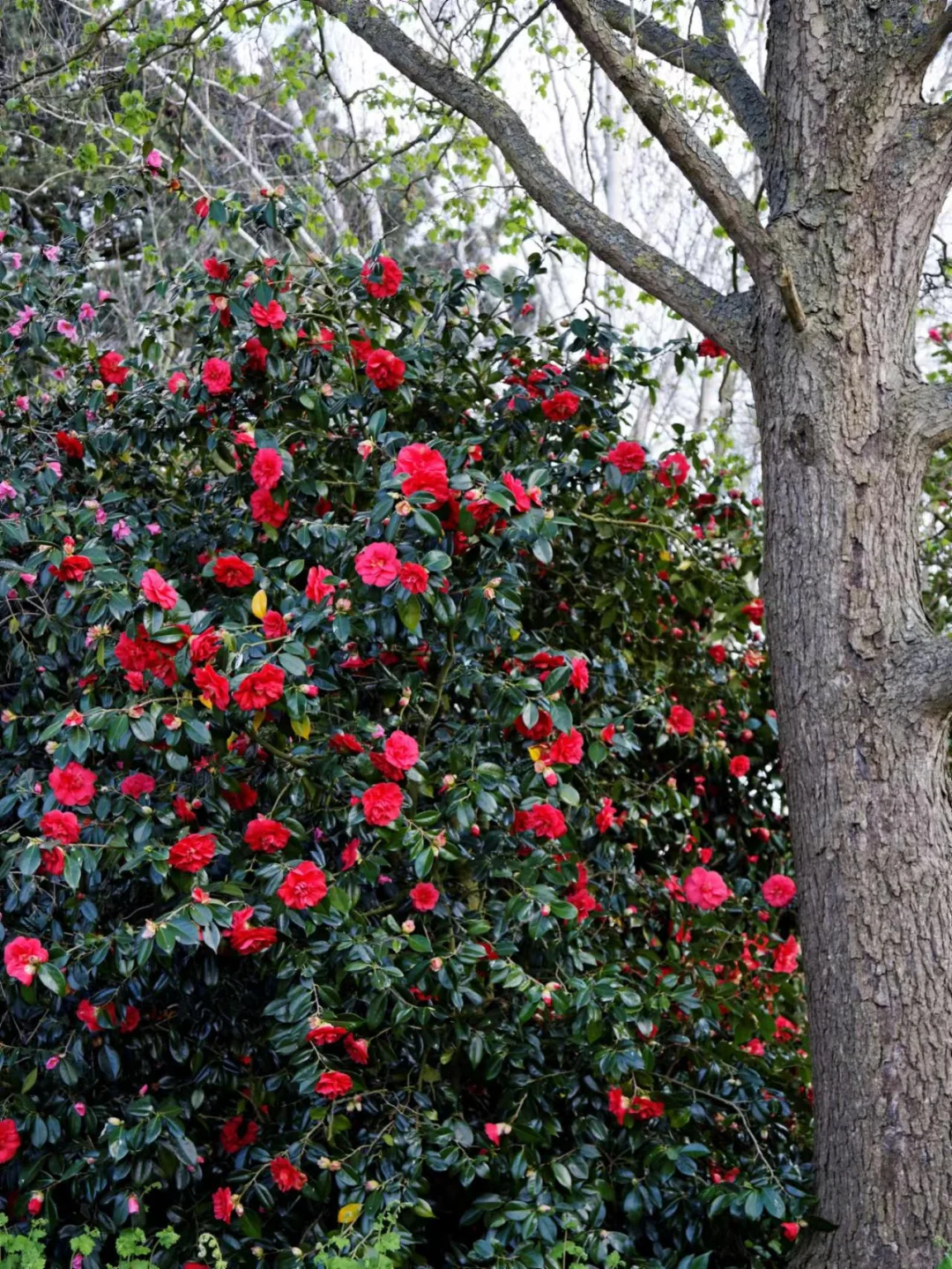山茶花是典型的"耐寒花卉",重庆冬季的气温刚好满足它的开花温度需求。它的花瓣厚实,能锁住水分,抵御低温,而冬季开花还能避开春季的百花竞争,吸引更多传粉昆虫,是适应环境的聪明选择。