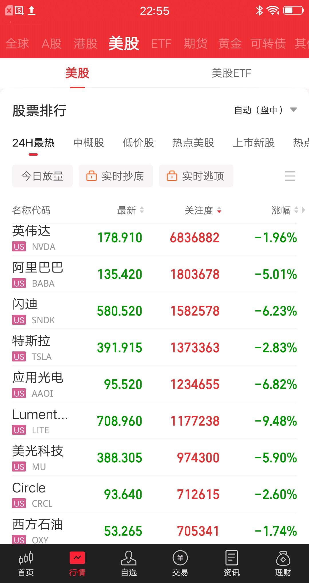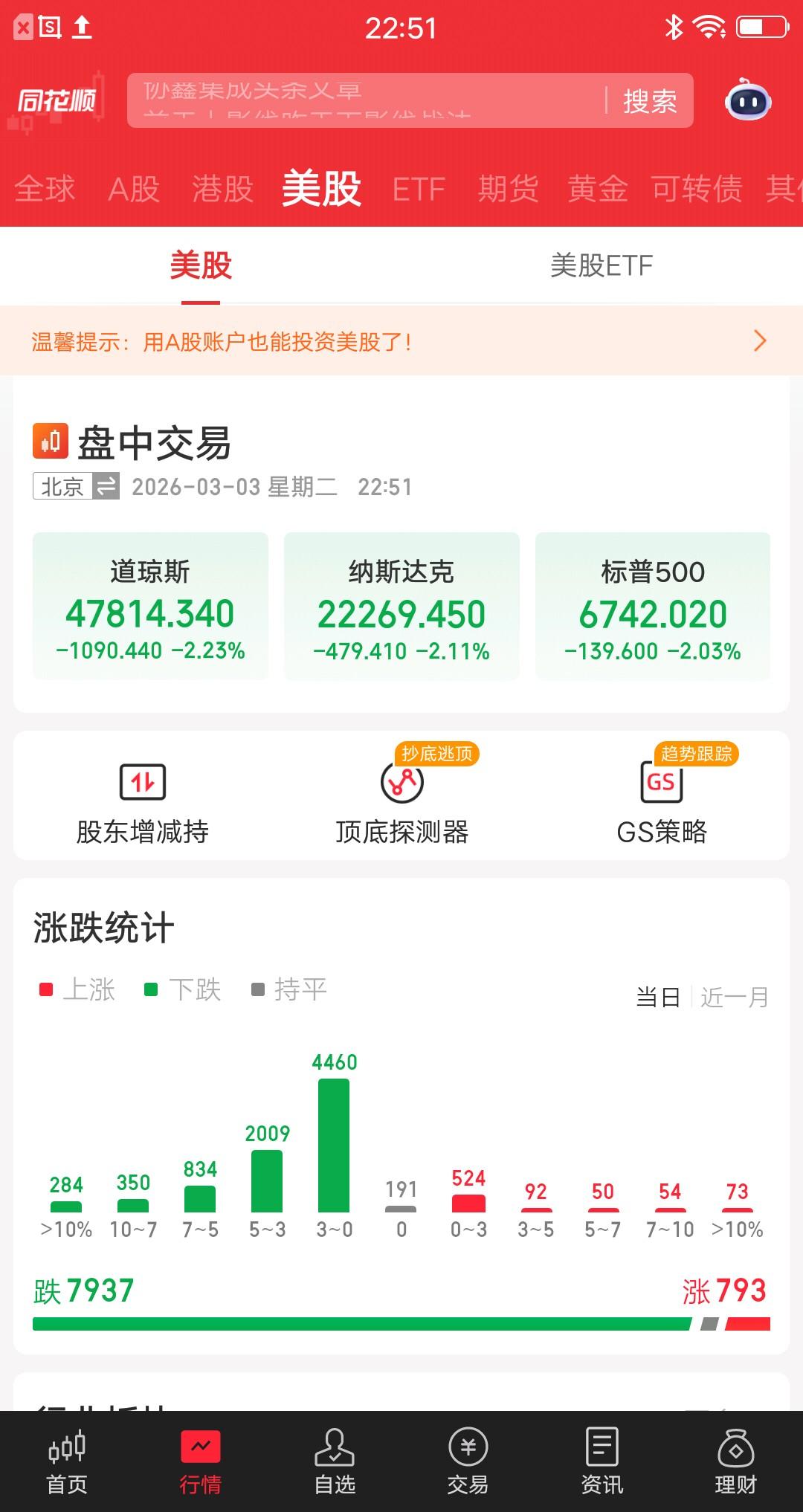 美股跌惨了,明天大A会不会跟跌,真的好心慌呀。道琼斯大跌2.23%,纳指大跌2.11%,标普大跌2.03%。 苹果 -0.79%,微软 -0.87%,西方石油 -1.74%,纳斯达克100 -1.94%,英伟达 -1.96%,谷歌A -2.09%,Circle -2.60%,特斯拉 -2.83%,超威半导体 -3.54%,阿里巴巴 -5.01%,Coherent -5.56%,美光科技 -5.90%,闪迪 -6.23%,应用光电 -6.82%,康宁 -6.94%,Lumentum -9.48%,富时中国3倍 -11.10%。 普遍下跌,一片绿油油的。有没有上涨的呢,极少数逆势上涨。 Front Month 原油大涨6.37%,WTI 原油指数大涨8.55%。 其实和A股一样,受益冲突的大涨,其他不受益的基本全跌。 今天的美股已经恐慌了,跌幅就是最好的证明,三大指数集体大跌的情况平时很少。资金在担忧局势的发展,本来以为是闪电战,现在成了拉锯战,打的有来有回,人家丝毫不怕。 川普真喜欢搞事情,对等关税搞崩了股市,现在揍伊朗又搞崩了,赶紧下台吧。大A怎么办,慌得一批。