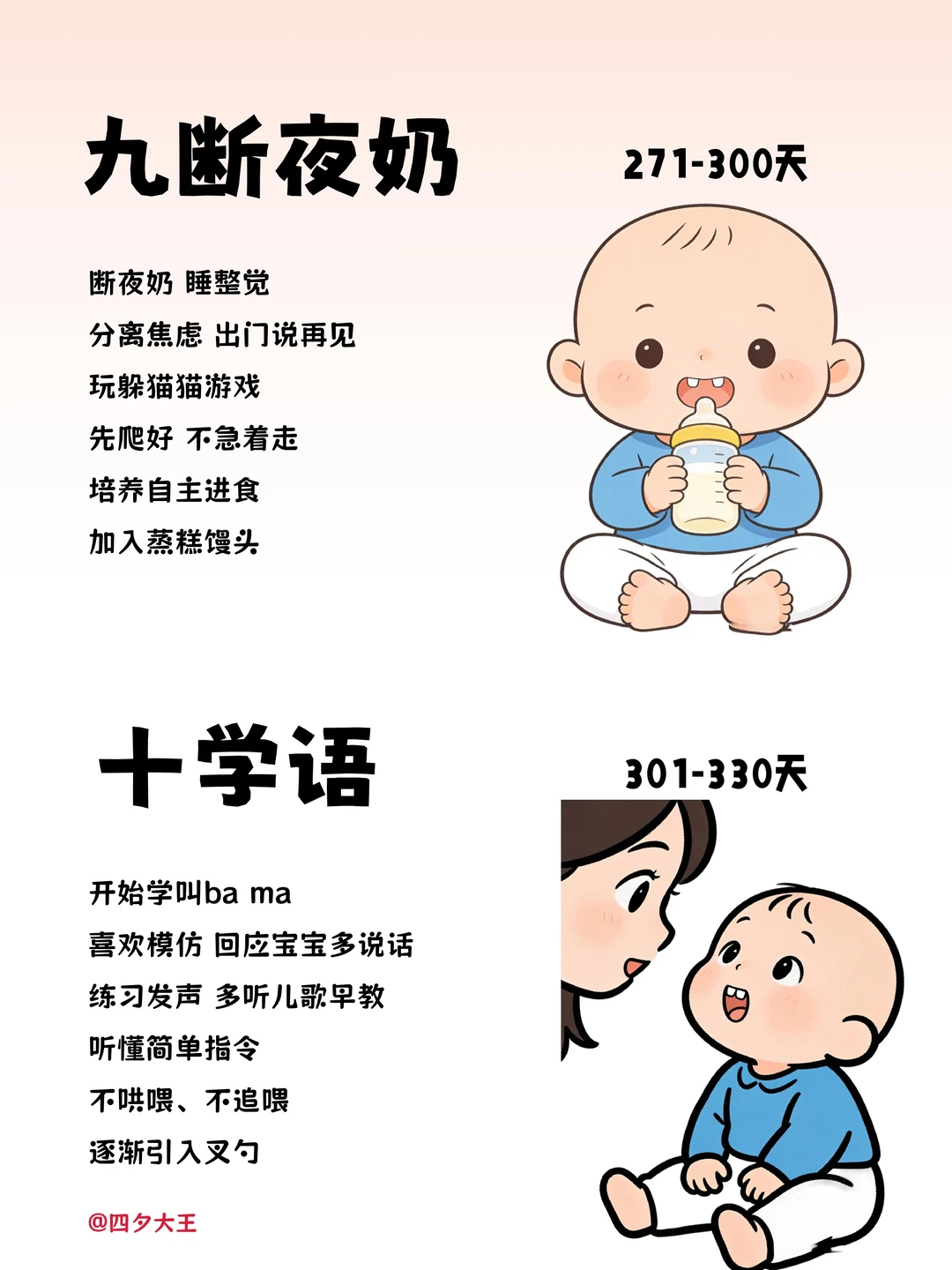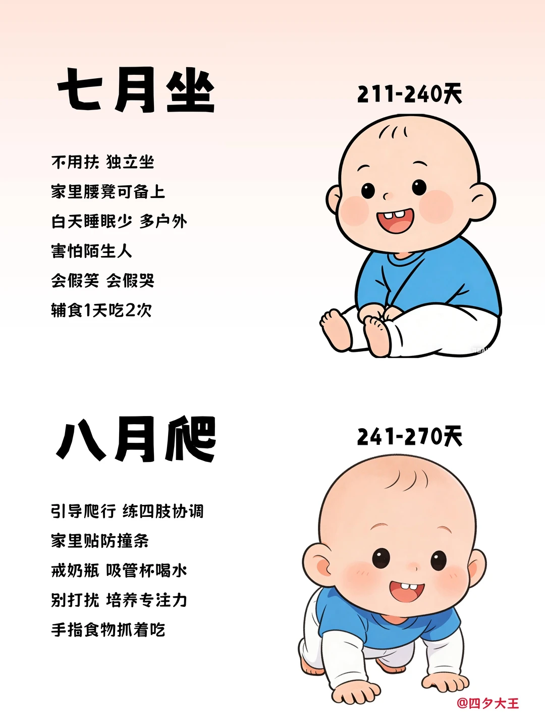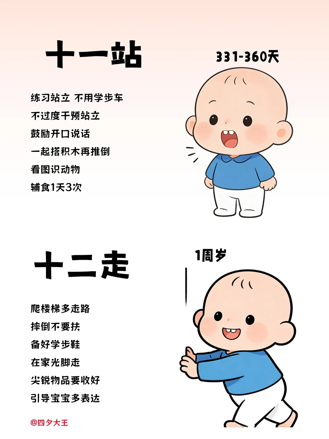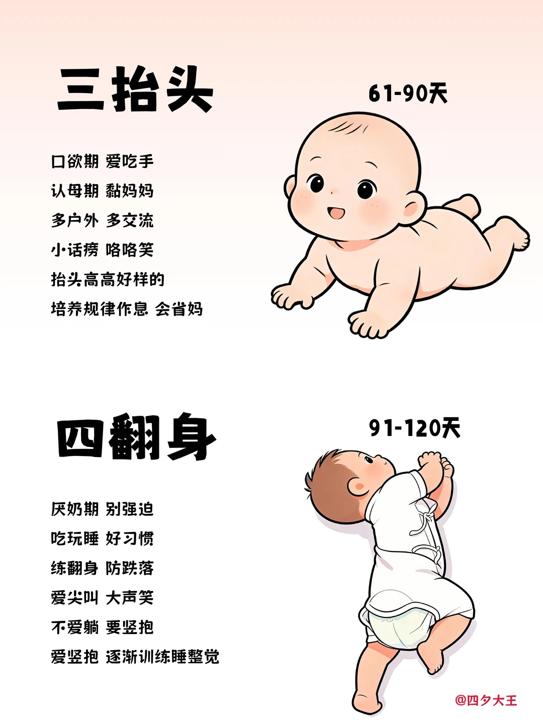 . 新手爸妈必看‼️ 宝宝0-12月成长真有趣 记住这些口诀: 一月睡 二月闹 三抬头 四翻身 五出牙 六辅食 七会坐 八会爬 九断夜奶 十学语 十一站 十二走