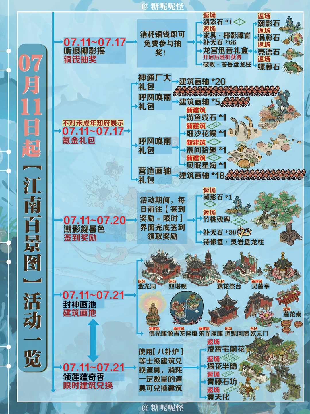 1️⃣新建筑:藏珠碧渊潭|灵莲亭|朱雀座雕|青龙座雕|佛光雕像|游鱼戏石|细沙花鳗|潮间拾趣|霜华古藤|白鹭青荷|贝眠星海 2️⃣返场建筑:封神画池往期返场|凌霄宅前花|墙花半隐|青藤石坊|游凤画舫