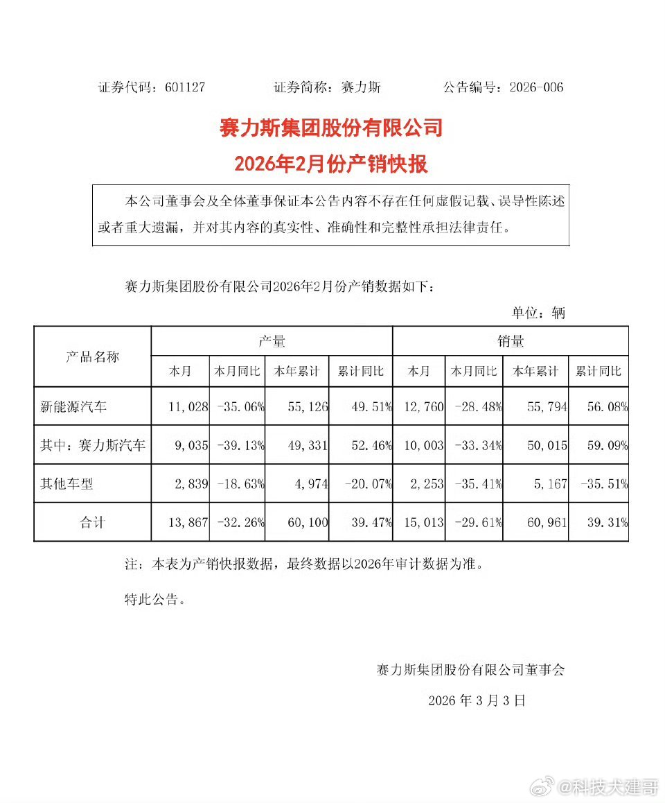 简单说,2月份主力“赛力斯汽车”产销量同比都跌了约三分之一,整体销量也下滑近30%,主要受春节长假影响。但把1-2月加起来看就完全相反了:累计销量同比暴涨近60%,势头依然很猛,说明1月开年卖爆了。