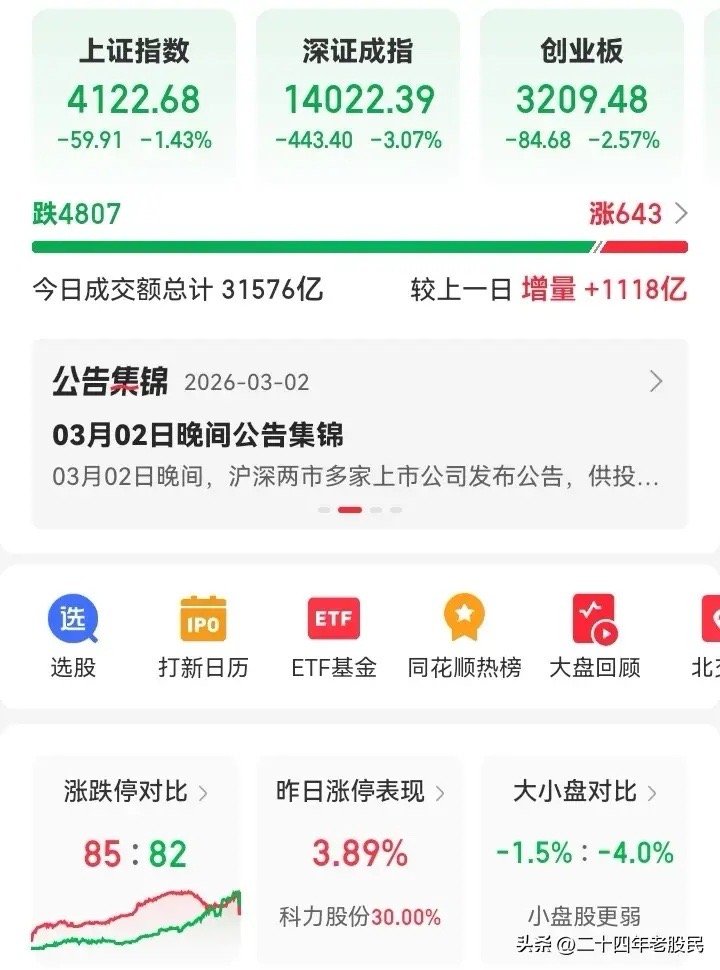 超过八成的股友今天应该都是亏损的,甚至很多还是节后亏损最大的一天,现在最关心的肯定是何时止跌,并且心中一定有个疑问,为什么会跌这么多,市场为什么突然就没了承接。对于三大指数而言,已经在目前极为狭小的区间横盘了约两个月,在此期间我们经历了ETF巨额赎回,高息红利持续调整,各大题材轮翻表演,但是指数却是像被焊死了一样,因为新增开户激增,股民热情空前高涨,正好可以起到抵消作用,但是如此一来主力正好有序退出。记得前几天的时候,我说均线开始粘合将要大变盘,随后遇上了中东冲突,因此在一定程度上加速了挤泡沫的速度,同时前期主力资金己经撤出了不少,所以今天的承接就变得更加的弱。好消息是明天将迎来两会,按照以往惯例,市场会出现维稳资金,但是大家也不能过于乐观,其方向大概率还是以高息红利央企为主,帮助稳定指数的同时可以最大可能的延缓高位题材的下跌速度,甚至产生一定的小反弹,对于高位题材原则上还是见好就收为主。