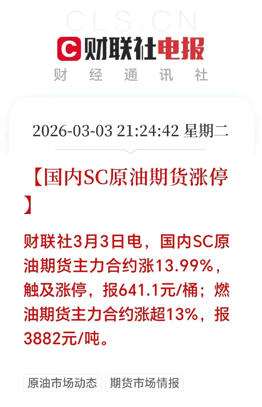 就在刚刚,国内原油期货直接封死涨停,燃油、液化气同步暴涨,国际油价持续冲高。