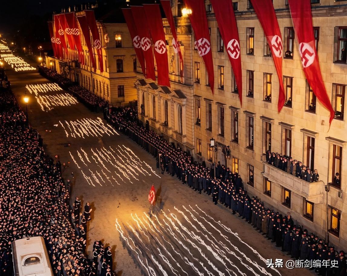 1933年1月30日那个改变世界的夜晚,在柏林帝国总理府的阳台上,阿道夫·希特勒正俯瞰着下方如火龙般蜿蜒的火炬游行。就在当天,他刚刚被任命为德国总理,而这场盛大的仪式,正是纳粹党向世界宣告其权力的宣言。 夜幕下,冲锋队员们高举火炬,整齐的队列在街道上划出刺眼的光带,与建筑外墙上悬挂的万字旗交相辉映。街道两旁,密密麻麻的支持者们沉浸在狂热的欢呼中,整个城市仿佛被一种集体的迷梦所裹挟。这并非自发的庆祝,而是一场经过精心策划的政治表演,它用极具煽动性的视觉语言,将纳粹的力量、秩序和所谓的“民族复兴”刻入每一个见证者的心中。 然而,这耀眼的光芒之下,是一个国家滑向深渊的开始。这场火炬游行不仅是纳粹夺权的庆祝,更是其独裁统治的序曲。它预示着自由的熄灭、理性的沉沦,以及一场席卷全球的浩劫即将到来。 德国二战老照片 德国历史影像 历史 历史老照片 二战 德国