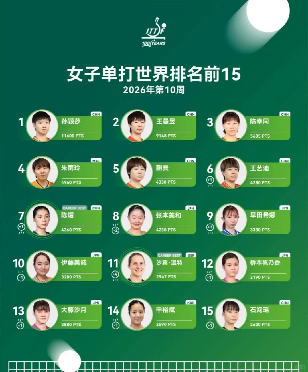 国际乒联 2026年第10周世界排名,一眼就能看出格局! 单打莎头断层领跑,国乒统治力拉满! 双打全线失守,外协会强势登顶。 一边是孙颖莎、王楚钦稳居世界第一,积分遥遥领先,单打基本盘比较稳固; 一边是男双、女双、混双世界第一全被国外组合拿走,国乒双打进入阵痛期。 这既是战略保单打、锻炼新人的结果,也敲响了警钟:双打必须尽快稳住配对、补齐短板。 有巅峰,有挑战,这才是最真实的国乒现状吧! (图片来源于网络)