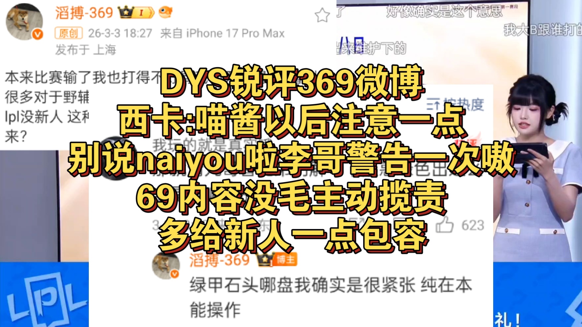 DYS锐评369微博,西卡:喵酱以后注意一点,别说naiyou啦李哥警告一次嗷,69内容没毛主动揽责,多给新人一点包容
