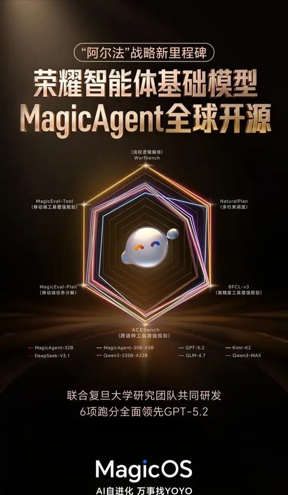【荣耀宣布MagicAgent全球开源, 六大性能领先GPT-5.2】