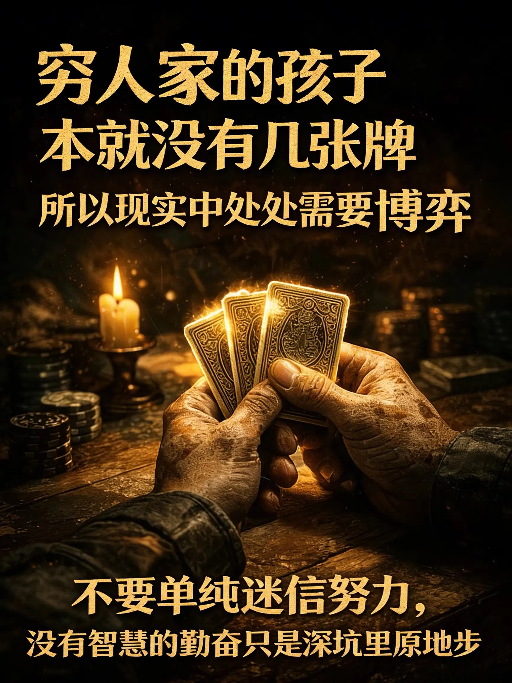 不要单纯迷信努力,没有智慧的勤奋只是瞎忙。在这个处处需要博弈的时代,单凭“努力”真的能翻身吗? 如果你的认知是被继承的,那你的阶级也是被继承的。 真正的“富人教育”从来不只是课本知识,而是兵法、谋略、胆识和对社会底层逻辑的穿透力。 我们要学的不是如何卷过别人,而是如何跳出规则,重新配置自己的资产和人生。 如果你正处于人生十字路口,感到焦虑或无助, 请记得:人生处处有希望,前提是你敢于拆掉思维里的墙。