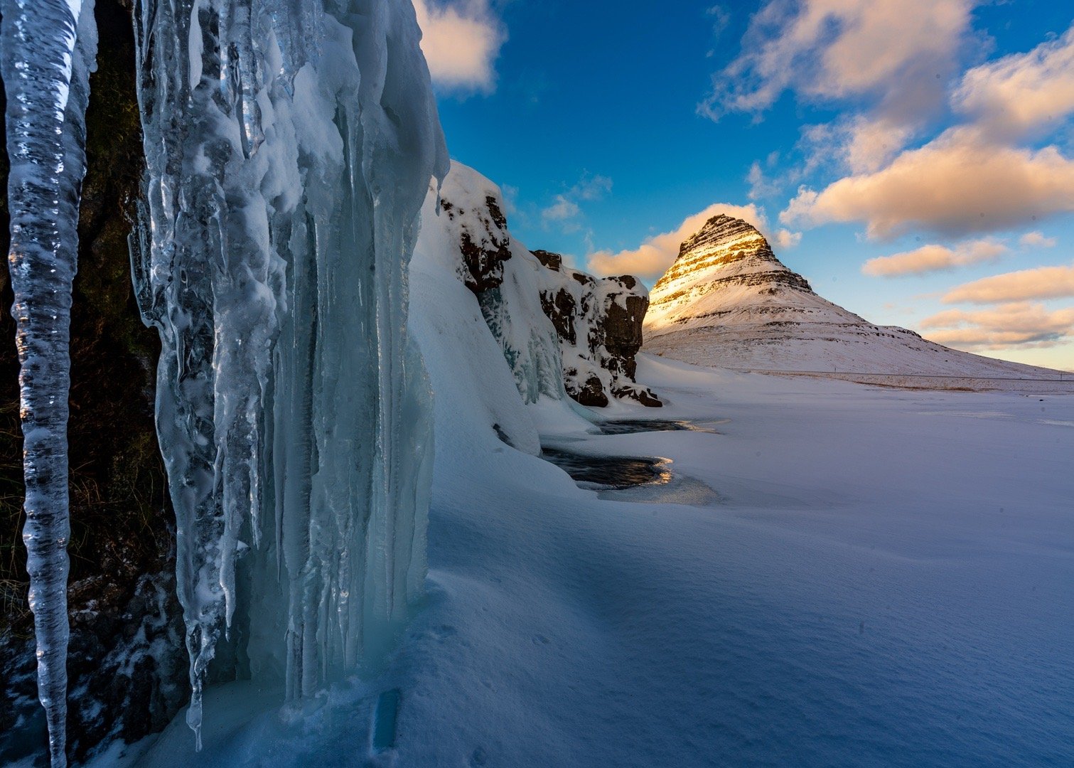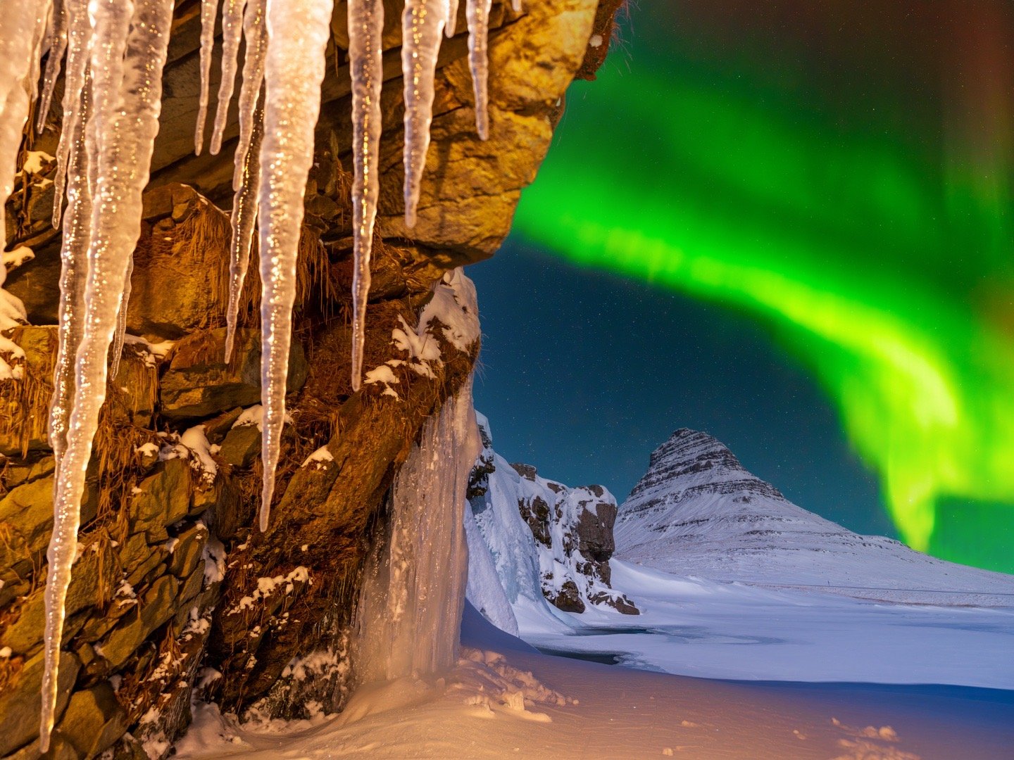 从傍晚到午夜。站在冰瀑边,积雪齐膝,看冰岛草帽山沉默。天空亮起绿色丝带,那是北境的呼吸。飞侠行摄冰岛 冰岛·格伦达菲厄泽