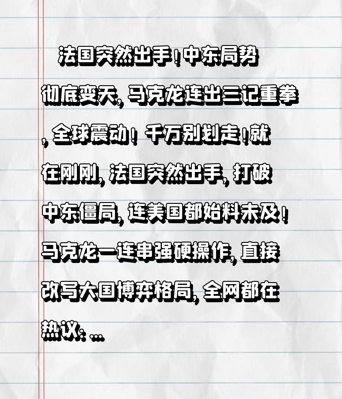 👇 法国突然出手!中东局势彻底变天,马克龙连出三记重拳,全球震动! 千万别划走!就在刚刚,法国突然出手,打破中东僵局,连美国都始料未及!马克龙一连串强硬操作,直接改写大国博弈格局,全网都在热议:法国这是要彻底“单飞”了吗? 中东战火愈演愈烈,美以联军猛攻伊朗,地区局势濒临失控。所有人都以为欧洲会跟着美国站队,法国却一反常态,打出一套组合拳:先是公开表态美以行动未经联合国授权、不合法,和美国划清界限;紧接着,驻阿联酋阵风战机紧急升空,击落来袭无人机,保护基地与侨民安全;更重磅的是,戴高乐号航母全速开进地中海,同时向塞浦路斯增派反导与护卫舰,本土安全警戒全面升级。 重大转折点来了!法国不再做美国跟班,而是打出“战略自主”王牌! 一边军事护侨、正当防卫,亮明硬实力;一边呼吁停火降温,坚持外交谈判,反对局势升级。马克龙还甩出王炸:宣布扩充核武库,推出“前沿威慑”计划,拉上德、英、波等8个欧洲国家,打造欧洲独立安全框架,摆明要摆脱依赖、掌握话语权。 很多人看不懂:法国为什么突然强硬? 一来,中东有几十万法国侨民,利益攸关,必须自保;二来,多年追随美国,并未换来对等尊重,法国决心走自己的路;三来,大国博弈当前,谁能稳住局势、主持公道,谁就能占据道义高地。这一波操作,既护安全,又争主导权,步步精准。 战火之下,没有真正的旁观者。航母巡航、战机升空、外交博弈,看似遥远,实则牵动全球能源、物价与每个人的生活。我们看到的是军事调动,背后是无数家庭的安危,是普通百姓对和平的朴素期盼。大国争锋,最受伤的永远是平民。 法国突然出手,告诉世界:强权解决不了问题,对话才是出路。丛林法则早已过时,联合国宪章与国际法,才是守护和平的基石。我们庆幸生在中国,远离战火,国泰民安,更懂得和平来之不易。 愿航母化作和平之舟,愿战机守护安宁而非制造硝烟,愿中东硝烟早日散去,愿每一个生命都被善待。和平,才是人类最珍贵的财富;稳定,才是世界最需要的答案!