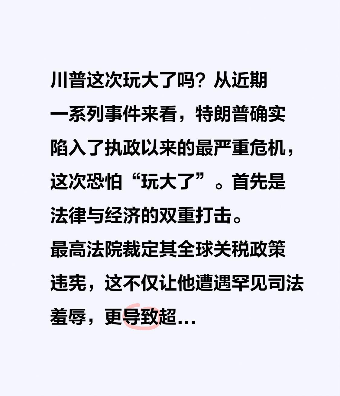 川普这次玩大了吗? 从近期一系列事件来看,特朗普确实陷入了执政以来的最严重危机,这次恐怕“玩大了”。 首先是法律与经济的双重打击。最高法院裁定其全球关税政策违宪,这不仅让他遭遇罕见司法羞辱,更导致超1700亿美元税款面临退还,上千家企业已提起诉讼 。 其次是内部的猛烈反噬。未经国会授权对伊朗发动军事打击,彻底激怒了“MAGA”基本盘。包括前福克斯名嘴卡尔森、众议员格林在内的铁杆盟友公开炮轰其“背叛美国优先”的承诺 。 在外有法律围堵、内有核心倒戈的夹击下,其民调已跌至36% ,政治颓势尽显 。川普特朗普