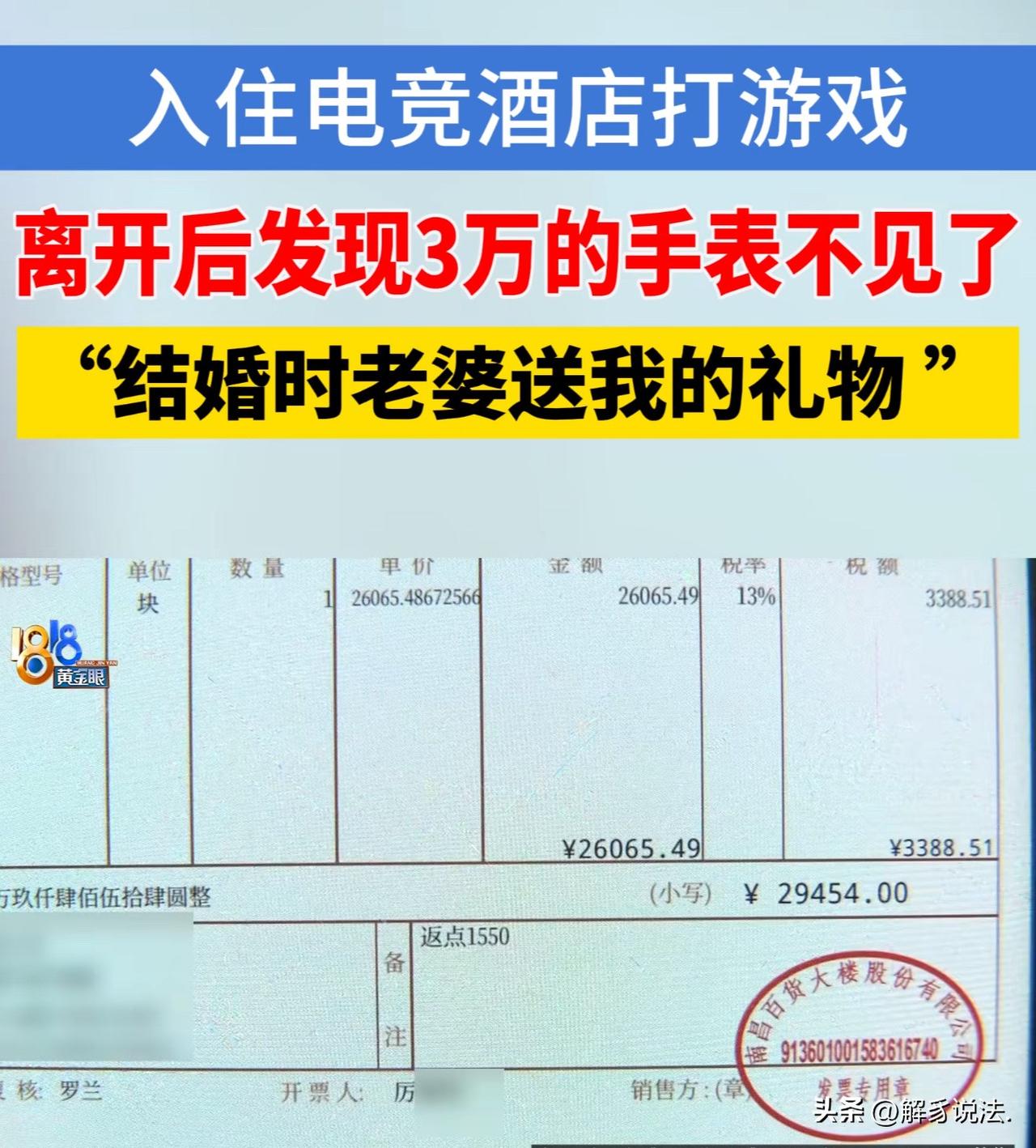 浙江义乌,男子和同学、表弟三人入住一家电竞酒店打游戏,离开时,发现手腕上的浪琴手表不见了,这块手表买的时候花了3万多,是结婚时妻子送的,有特别的纪念意义。他赶紧给酒店前台打电话,前台一口咬定表没落在酒店,男子赶紧按自己之前的行动轨迹找了一遍,均无果。最后,他想起来,去酒店前自己进了旁边的一家小卖部,他赶紧来到小卖部,调取监控。监控显示,他当时手腕上戴着手表。他这才确定表就是落在酒店里了。结果,当他再次返回酒店时,酒店的态度让他失望至极。 2026年2月19日,罗先生的初中同学来家中拜年,两人相识多年、关系要好,且都喜欢打游戏。 罗先生便叫上表弟,三人一同前往电竞酒店,房间由罗先生在平台预订。 当晚三人在房间打游戏,表弟于20日凌晨零点多离开,罗先生和同学留在酒店过夜。 次日上午,罗先生与同学离开酒店约5分钟后,他感觉手腕上空空的,心里一咯噔,这才发现手表不见了。 这块浪琴手表于是2024年1月30日购买,价值近3万元,更重要的是,这是妻子送他的结婚礼物,纪念意义非凡。 当当即怀疑是落在酒店房间,他立刻致电前台求助。 可前台回复未发现手表,罗先生出于信任,没有返回酒店复查。 随后,罗先生赶紧逐一排查此前去过的所有地方,家里也翻了个底朝天,均未找到手表。 他想起入住前曾在酒店附近小卖部买饮料,赶紧去调取监控,结果发现,2月19日19点31分结账时,他左手仍戴着手表,之后便直接返回酒店,再未外出,由此确认手表一定带入了酒店房间。 等罗先生赶回酒店时,房间已被打扫干净,他仔细搜寻仍无结果。 罗先生这才想起来,当时,因打游戏需要操作键盘,他一进房间就摘下手表,放在中间空置的床上。 罗先生多次与酒店沟通,表示只要归还手表,愿拿出一两万元作为感谢,且不追究任何责任,但酒店始终没有回应。 罗先生只能报警,警方拷贝酒店相关资料后表示,手表属于个人遗失,并非盗窃,无法立案。 无奈之下,罗先生找来媒体,帮自己向酒店讨要说法。 记者了解到情况后,拨通了酒店负责人的电话。 酒店负责人一口咬定,相信自己的员工不会拿手表,并表示他们对员工培训过,如果捡到遗失物会做出合理的处理方式。 同时,酒店负责人反咬一口,质问罗先生你怎么能证明不是你同行的人拿的手表呢? 罗先生说,和自己同行的是表弟和同学,一位是至亲、一位是十几年的好友,绝无可能拿走手表。 就这样,双方陷入僵局,一方坚决相信自己的员工,一方坚决相信自己的随行人员。 罗先生指出,自己已告知前台遗失的是贵重物品,酒店按规定应安排双方陪同、全程摄像排查,却未按流程操作。 酒店负责人解释,事发正值春节期间,人手不足,导致未能依规处理。 最后,罗先生说,自己未妥善保管贵重物品,存在一定责任,提出自己与酒店各担一半责任的解决方案。 酒店负责人承诺,会核实当班员工信息,若仍无结果,将与罗先生一同到派出所协商解决。 此事曝光后,网友坐不住了,纷纷给出自己的看法: 有句老话叫“家贼难防” 当事人说他们是亲戚朋友关系不会拿,那酒店方是服务顾客的 按道理双方都不会干这种事,万一不是酒店员工拿的不是冤枉吗?没有证据的情况下别下结论! 一人一半?凭啥,酒店有啥责任。如果是被偷了,刑事。你自己丢了只能怨你自己。 你得有证据啊,要不然你自己藏起来,那老板赔死了。都这么搞,就是首富也扛不住这么造啊! 《民法典》第1198条规定:宾馆、商场等经营场所的经营者、管理者,未尽到安全保障义务,造成他人损害的,应当承担侵权责任。因第三人行为造成损害的,由第三人担责;经营者未尽安全保障义务的,承担相应补充责任。 本案中,罗先生能证明手表带入酒店,但无法直接证明是酒店员工拿走;酒店在接到贵重物品遗失告知后,未按规范双人陪同、摄像排查,存在管理流程瑕疵。 因没有盗窃证据,警方按遗失处理。罗先生自身疏忽保管,酒店存在流程疏漏,双方均有一定过错,因此,罗先生提出的各承担一半责任是有法律依据的。