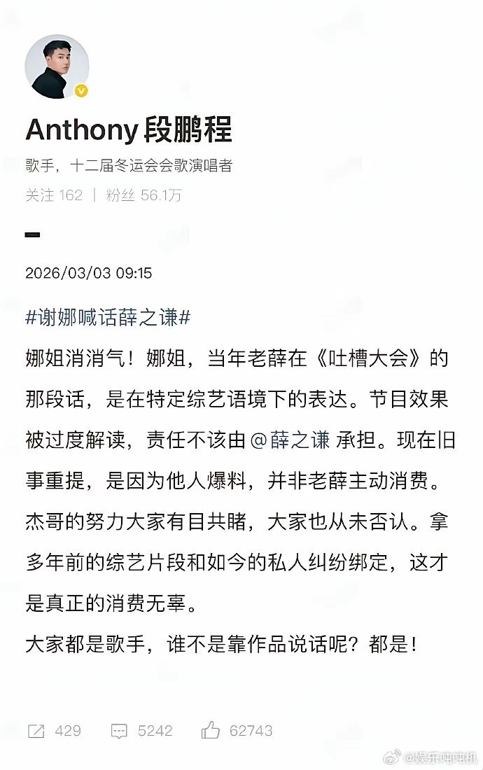 3月3日,艺人谢娜发长文喊话薛之谦,她表示:有些话,为了家人,我必须说!这次旧事被翻出来,是因为薛之谦的感情纠葛带出来的。但根源,从来都在薛之谦那里!事件发酵后,歌手段鹏程再次发声为薛之谦解释:娜姐消消气!娜姐,当年老薛在《吐槽大会》的那段话,是在特定综艺语境下的表达。节目效果被过度解读,责任不该由薛之谦承担。现在旧事重提,是因为他人爆料,并非老薛主动消费。杰哥的努力大家有目共睹,大家也从未否认。拿多年前的综艺片段和如今的私人纠纷绑定,这才是真正的消费无辜。