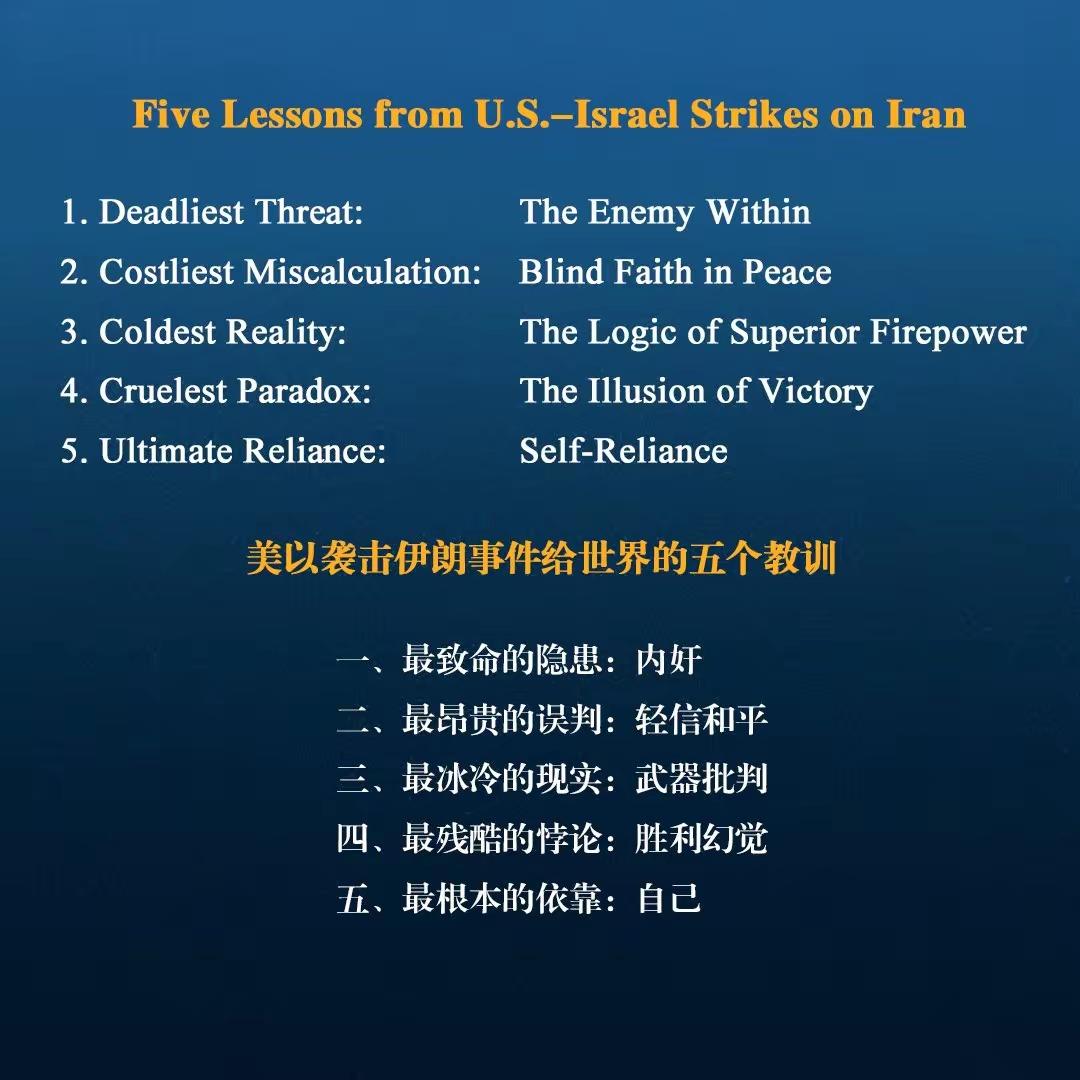 美以攻打伊朗对我们是一种警醒、更是一种启发。 当年美国攻打伊拉克,给全世界演示了一场现代战争如何推进的教学课。如今美以攻打伊朗则给我们上了一场认知课:堡垒有时候是从内部被攻破的,不能轻信敌人的“和平”话术,一切致胜的根本只有自己强大。 这就是军号给我们总结的五点美伊战争的警示点,大家讨论下还有没有其他补充的呢?