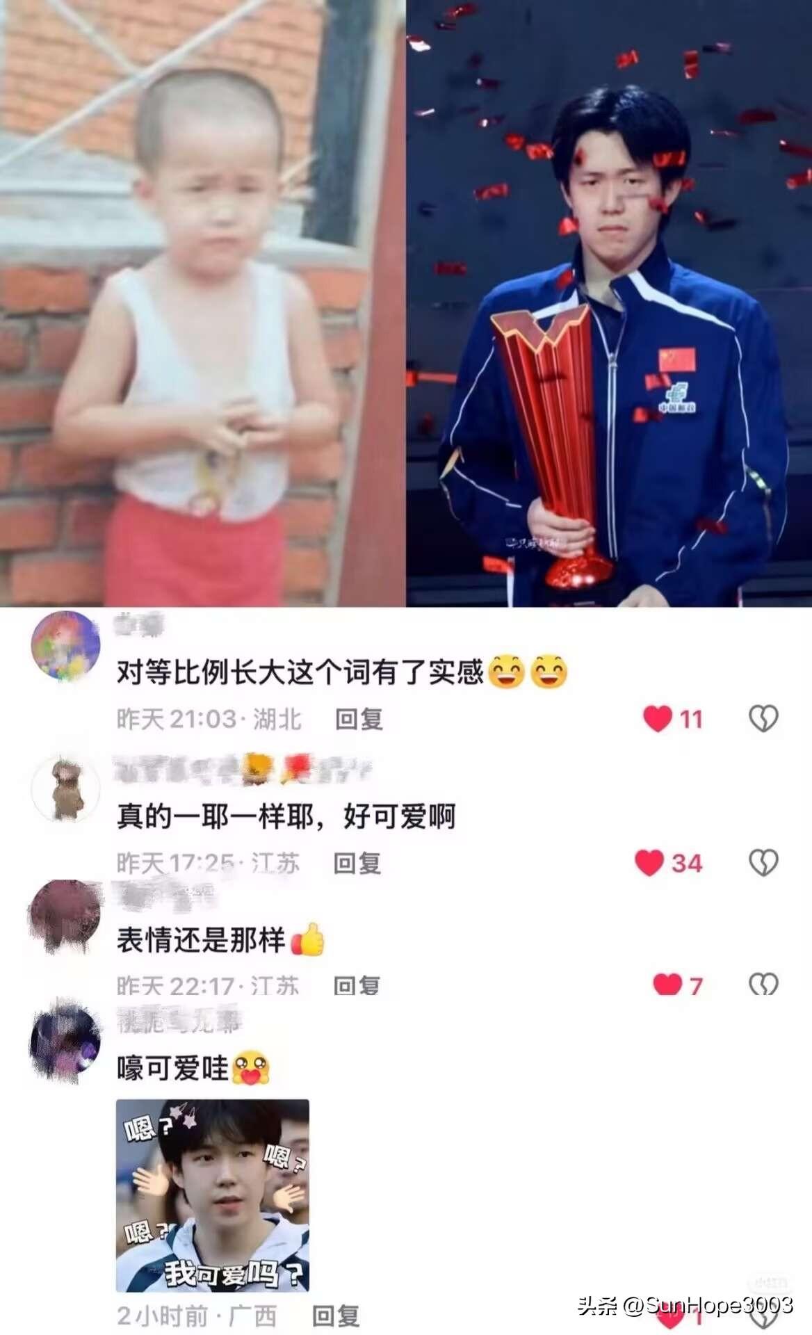 王楚钦表情和小时候一模一样,真的是等比例长大的孩子。 新加坡大满贯男单夺冠,下彩带雨的时候,王楚钦这表情,是不是瞬间想到了小时候的这张照片,确实很可爱。 从小到大,很拼很努力,楚钦妈妈说小时候看他们训练,感觉儿子的动作最舒展, 是的,一直到现在,打球的姿势也是最帅的。 这个表情的小孩,现在已经成长为国乒的领军人,左手的王楚钦扛起了一个又一个的责任, 真的很棒!