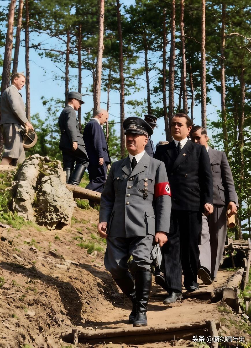 希特勒和他的亲信们在贝希特斯加登的山间散步,走在他后面的是阿尔伯特·施佩尔。只有元首的核心圈子成员才有资格跟他散步。 希特勒与贝希特斯加登的渊源始于1923年,他最初被介绍来到此地,深深迷恋上了这片山湖景色。1924年出狱后,他回到这里,并在上萨尔茨堡山完成了《我的奋斗》第二卷。1933年,他买下并逐步扩建了别墅贝格霍夫(Berghof)。这里不仅是他的私人住所,更成为了纳粹除柏林之外的第二政府驻地,许多重大决策,包括1938年逼迫奥地利投降的会谈,都发生在这里。 历史 历史老照片 二战 德国