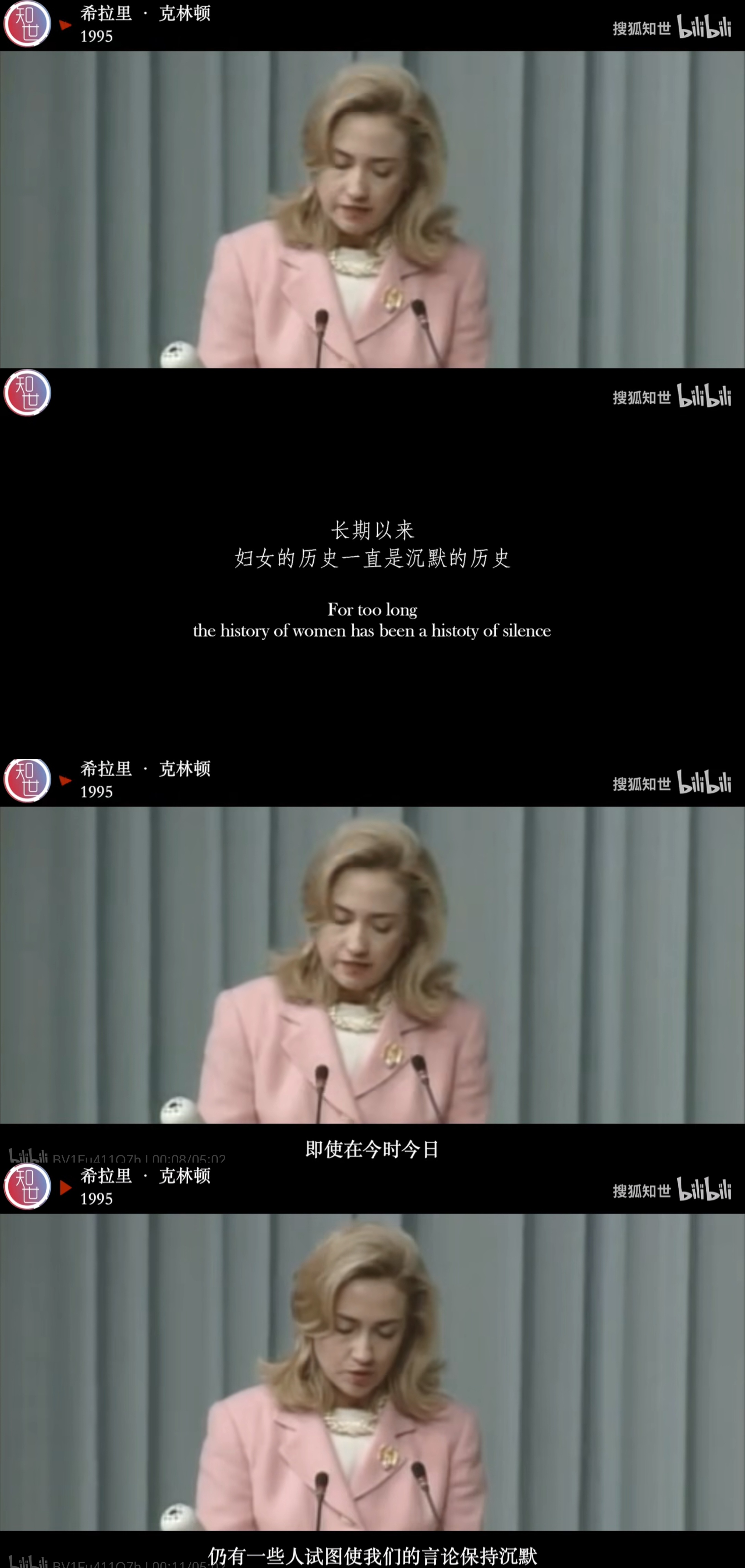 图一,希拉里1995在北京的联合国妇女峰会上的演讲。图二,希拉里2026在华盛顿接受爱泼斯坦案质询,多次试图打断爱泼斯坦案女性受害者发言。