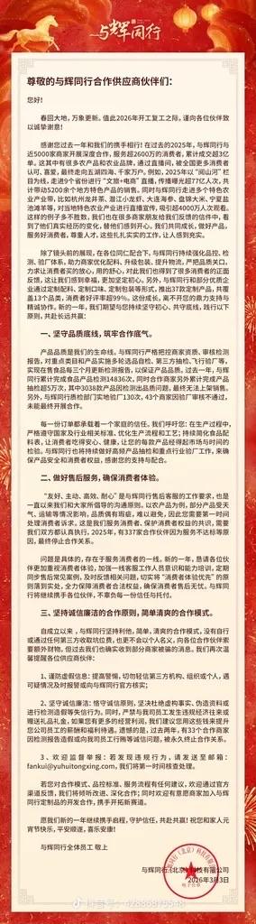 元宵佳节, 与辉同行给合作商家写了一封信。 这封信文字简洁明了, 没有什么“鸡汤”也没画大饼, 而是真诚的回忆过去展望未来。 在这封信里, 很多不为人知的数据曝光出来, “累计究战會品产品檢测14836次”, “同行质控部门实地验厂130次, 43个商家因不合格审核没通过终止合作”。 “337家因为售后不达标终止了合作”, “33个商家因为对工作人员行贿被终止了合作…… 这一组组数据是冰冷的, 但也是温暖的, 与辉同行在过去的一年, 虽然做不到尽善尽美, 但是在品控和售后服务方面他们一直在努力, 为的就是给消费者购物更好的体验感。 看完这封信, 我心里五味杂陈, 懂他们的都懂, 而那些“群演们”对这封信里面的每组数据都会一如既往的质疑。 比如这几天我很少逛抖音, 很多消息都是一些朋友私信发我的, 因为再在抖音玩下去, 我会患乳腺增生, 不想内耗自己, 所以选择不看不听。 我和朋友私聊, 都希望2026年与辉同行不卖农副产品了, 风险大利润低, 赚钱不多, 反而被那些人变着法的围追堵截, 何苦呢? 谁爱去卖谁去吧。 卖美妆卖高价商品不好吗? 又赚钱风险还低。 都说他只是为了赚钱, 那就把这个“帽子“戴稳, 不然对不起“群演”们。 这几个月不知道宇辉是怎么过来的, 反正我心里是两个字: 憋屈。 算了算了不说了, 我不内耗, 刷短剧去。 散会! 董宇辉