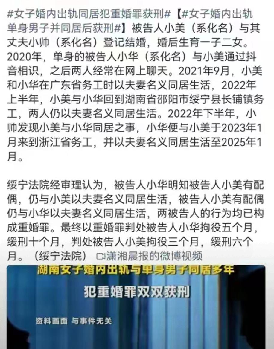 婚内搞在一起还敢对外装夫妻,简直是把法律当空气!小美没离婚就跟小华同吃同住,打工合租、回老家给彼此家人尽孝,邻居都以为是正经夫妻,这明摆着就是事实重婚,真当没领证就没人管了?更离谱的是三人还同住一套房,妻子和情夫睡主卧,丈夫睡沙发,这画面想想都膈应,小帅也是能忍,悄悄攒下所有证据,最后直接一波反杀,干得漂亮! 法院判的一点不冤,俩人都留了刑事案底,以后孩子考公政审都受影响,这都是自己作的孽!别以为没领结婚证,在一起过日子就没事,法律上只要以夫妻名义共同生活,就算重婚罪,这俩人四年的荒唐日子,到头来全是实打实的罪证。