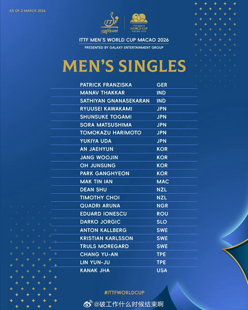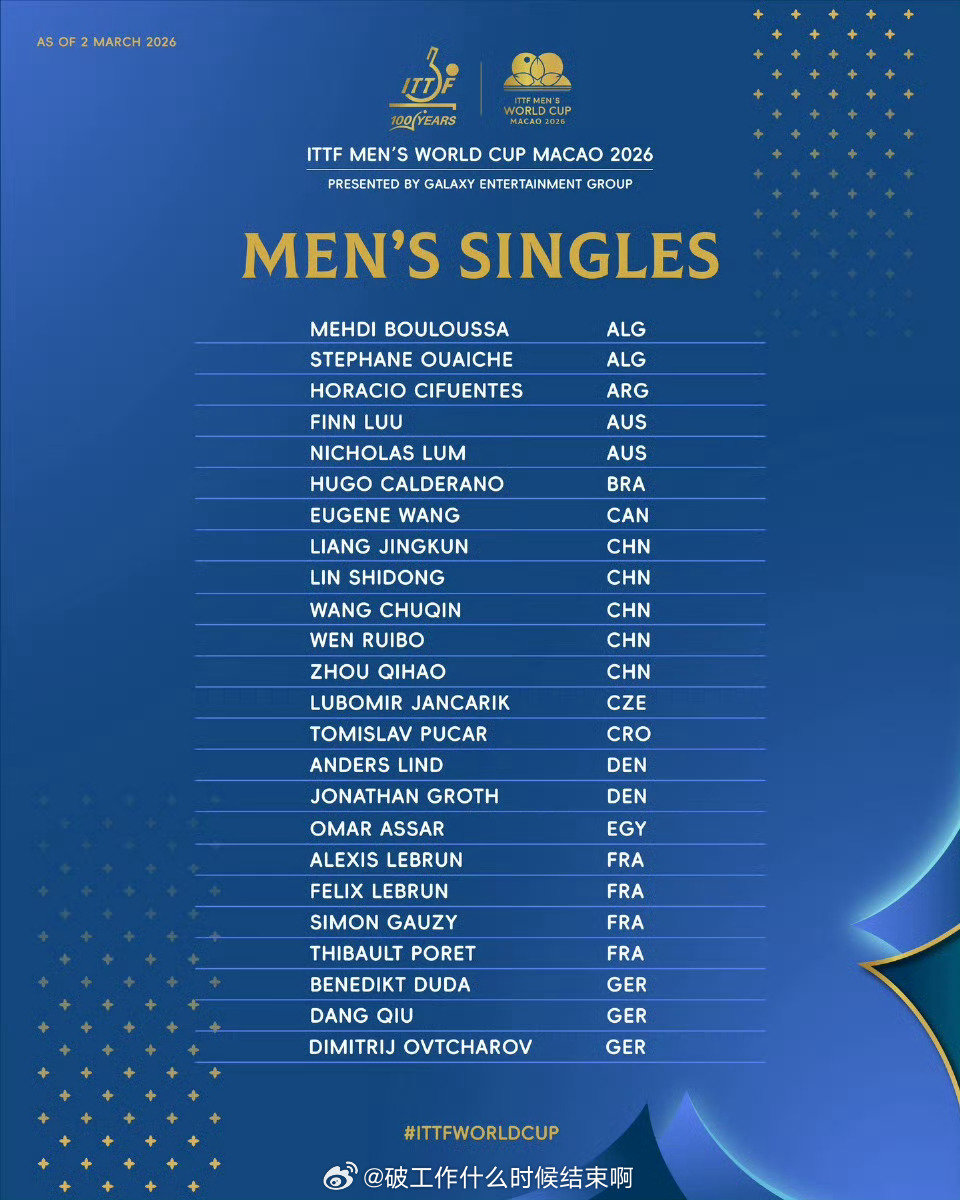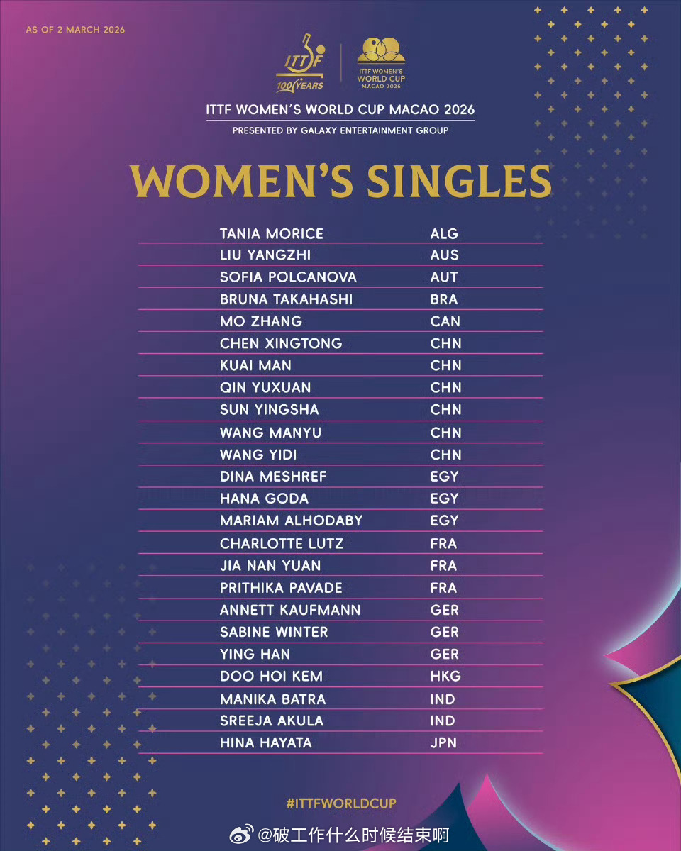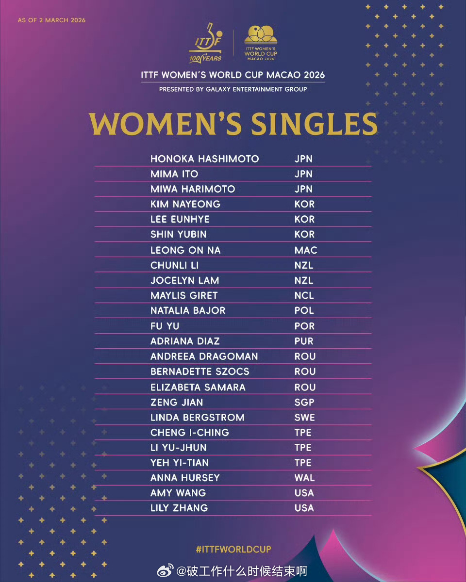 📍『2026年国际乒联男子、女子单打世界杯』