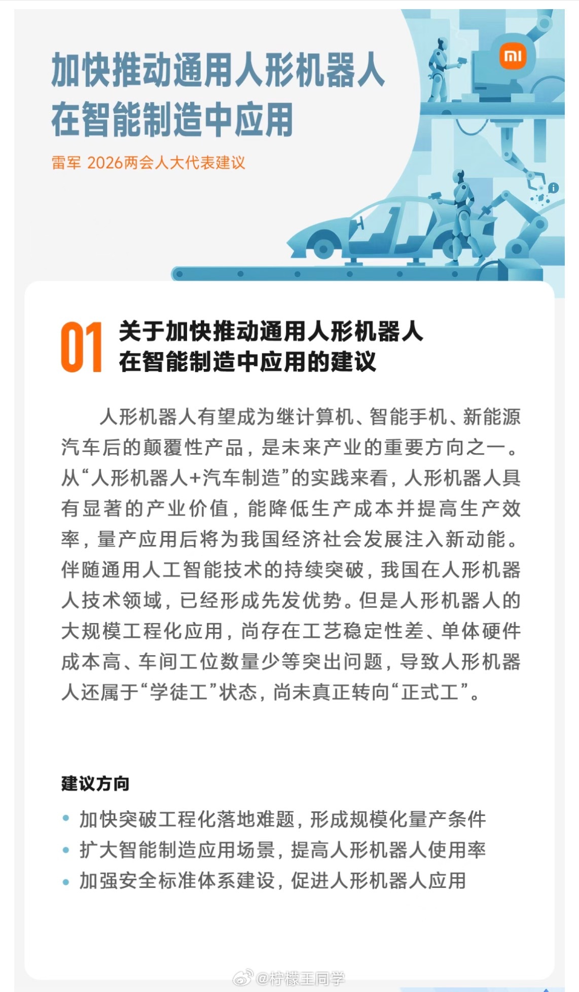 雷军建言加快人形机器人规模化量产今年两会雷总的第一条提议就是:要加快人形机器人规模化量产