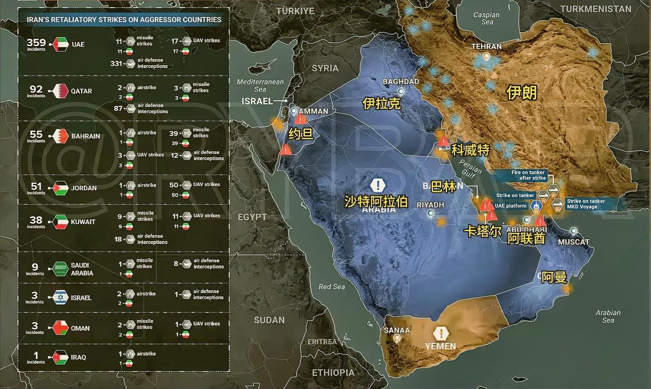 伊朗目前已经打击了美国在中东的27个军事基地,还同步袭击了以色列国防军总司令部、特拉维夫国防工业园区等核心军事目标。截至3月3日,伊朗已经发动超过14轮攻势,持续对相关目标进行补充打击。 这27个被打击的美军基地、设施,分布在巴林、卡塔尔、阿联酋、科威特、伊拉克、约旦、沙特7个中东国家,都是美军在中东的核心部署节点。 核心目标有: 巴林朱法尔海军基地。这是美国海军第五舰队司令部,美军中东海上力量核心。 卡塔尔乌代德空军基地。这是美军中央司令部前沿指挥部,中东最大的美军空军基地。 阿联酋达夫拉空军基地。这是美军F-35战机与无人机部署的核心枢纽。 科威特阿里·萨利姆空军基地、科威特海军基地。这里是美军在中东的后勤核心。 伊拉克哈里尔军事基地。这里是美军特种部队的核心驻地。 此次打击伊朗采用“饱和打击+多方向协同”的作战模式,以“无人机消耗防空、导弹精准突防”为核心战术,动用了“法塔赫-2”高超音速导弹、“霍拉姆沙赫尔-4”中程弹道导弹、“见证者-136”自杀式无人机等主力装备,从伊朗西部、南部多方向同步发起突袭,突破了美军“爱国者”、“萨德”防空系统的拦截。 巴林、阿联酋、科威特等国的当地民众都拍摄到了军事基地附近的浓烟与剧烈爆炸,多个海湾国家也已经被迫临时关闭领空,间接证实了袭击确实发生了,且覆盖范围极广。