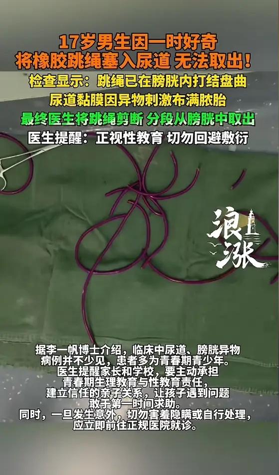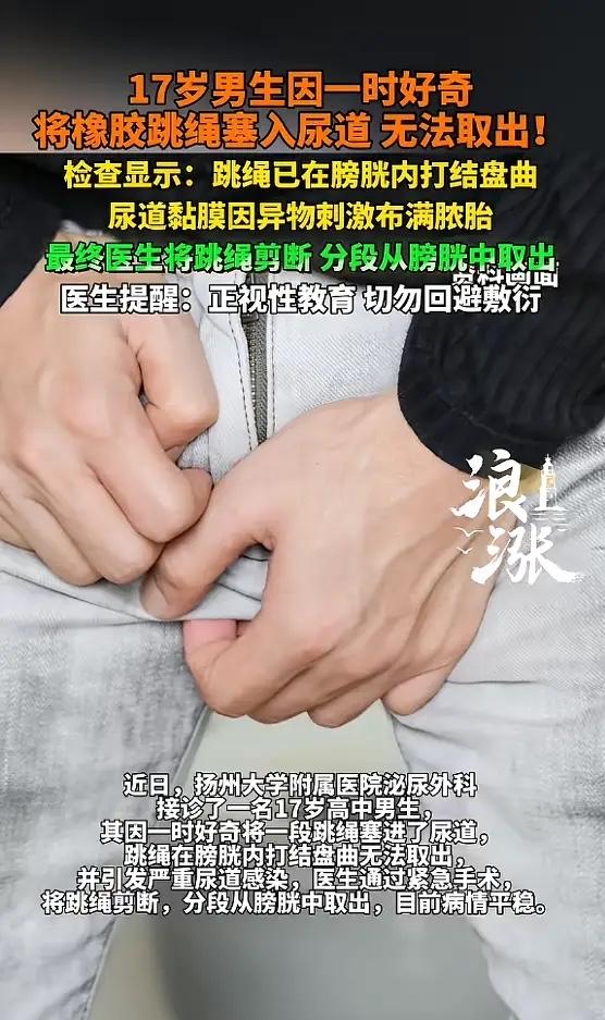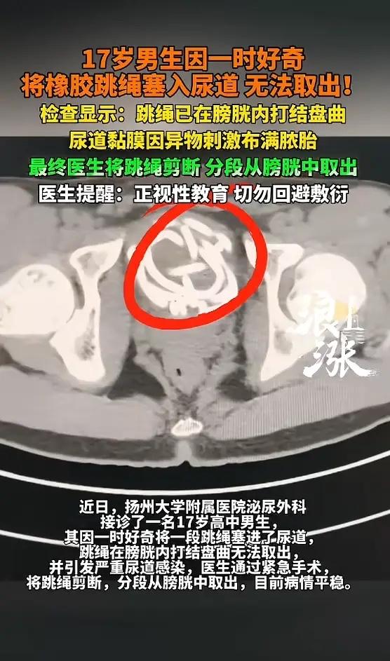 “离了个大谱!”近日,江苏扬州,一17岁高中男生因为好奇,竟将橡胶跳绳插入尿道,绳索相互缠绕,形成了难以解开的死结,最后没办法取出,疼的男生哇哇直叫,排尿困难,因为滞留时间较长,尿道出现了严重感染并形成脓胎!网友:丢人丢大了! 这事儿发生在2026年3月初,扬州大学附属医院泌尿外科。一个17岁的高中男生,被家长急匆匆送进医院。他疼得脸色发白,走路都困难,憋得满脸通红,就是尿不出来。 医生一问,孩子支支吾吾,最后才说实话。就是好奇,想试试看,把一根橡胶跳绳慢慢塞进了尿道里。一开始还能动,后来不知道怎么回事,绳子在里面打了结,盘成一团,怎么拽也拽不出来了。 他在家忍了很久,疼得受不了,又怕又羞,不敢告诉爸妈。直到实在憋不住,排尿像刀割一样疼,才哭着跟家长坦白。送到医院时,情况已经很危险了。 检查结果显示那根跳绳在膀胱里绕成了死结,因为异物在里面待的时间太长,尿道黏膜被严重刺激,已经布满了脓胎,感染得一塌糊涂。再拖下去,可能引发大出血、膀胱穿孔,甚至损伤肾功能,留下终身隐患。必须马上手术。 主治医生立刻安排了急诊手术,为了尽量减少对孩子的创伤,他们没开大刀,选择了腹腔镜微创手术。在肚子上打了几个小孔,把镜头伸进去。 手术视野里尿道里全是脓,膀胱里那根跳绳缠得死死的,结打得非常紧。医生用微型剪刀,一点一点把绳子剪断,再分段取出来。整个过程必须极度精准,不能伤到周围脆弱的组织。 手术很成功,取出来的跳绳有十几厘米长。术后,医院又联合儿外科,给孩子进行了抗感染治疗。好在送医还算及时,孩子的泌尿功能保住了,目前恢复得比较平稳。 尿道、膀胱异物的病例,其实并不少见,患者有很多是青春期的孩子。这个年纪的孩子,身体快速发育,对自己充满好奇和探索欲。这是正常的生理心理现象。可问题在于,他们往往缺乏正确、科学的生理健康知识。学校教得笼统,家里更是避而不谈,觉得“难以启齿”。 好奇心得不到满足,又不好意思问。他们就会自己偷偷“做实验”,上网搜些乱七八糟的信息,或者模仿一些危险行为。一根跳绳、一支笔、一颗小珠子……都可能成为他们探索身体的工具。 一旦出事,巨大的羞耻感会把他们压垮。他们第一反应是隐瞒,自己想办法弄出来,结果越弄越糟。拖到忍无可忍,才被迫求助。这时候,身体往往已经受到了不小的伤害。 网友调侃“丢人丢大了”,其实这种嘲笑,恰恰反映了社会对青春期性教育的一种回避态度。觉得这是“丑事”,是“丢人”。这种氛围,只会让孩子更不敢开口。 这件事真正该讨论的,不是孩子的“奇葩”行为,而是我们到底给了他们什么样的教育和支持。家长和学校,能不能坦然地把身体知识讲清楚?能不能告诉孩子,哪些探索是安全的,哪些边界绝对不能碰? 能不能建立一个信任的沟通环境,让孩子知道,无论发生什么,都可以第一时间告诉爸妈,而不会挨骂、被嘲笑?这才是避免下一次“跳绳事件”的关键。 好奇心不是错,错的是让好奇心在黑暗中盲目摸索。点亮那盏教育的灯,才能照亮孩子安全成长的路。 各位读者你们怎么看?欢迎在评论区讨论。