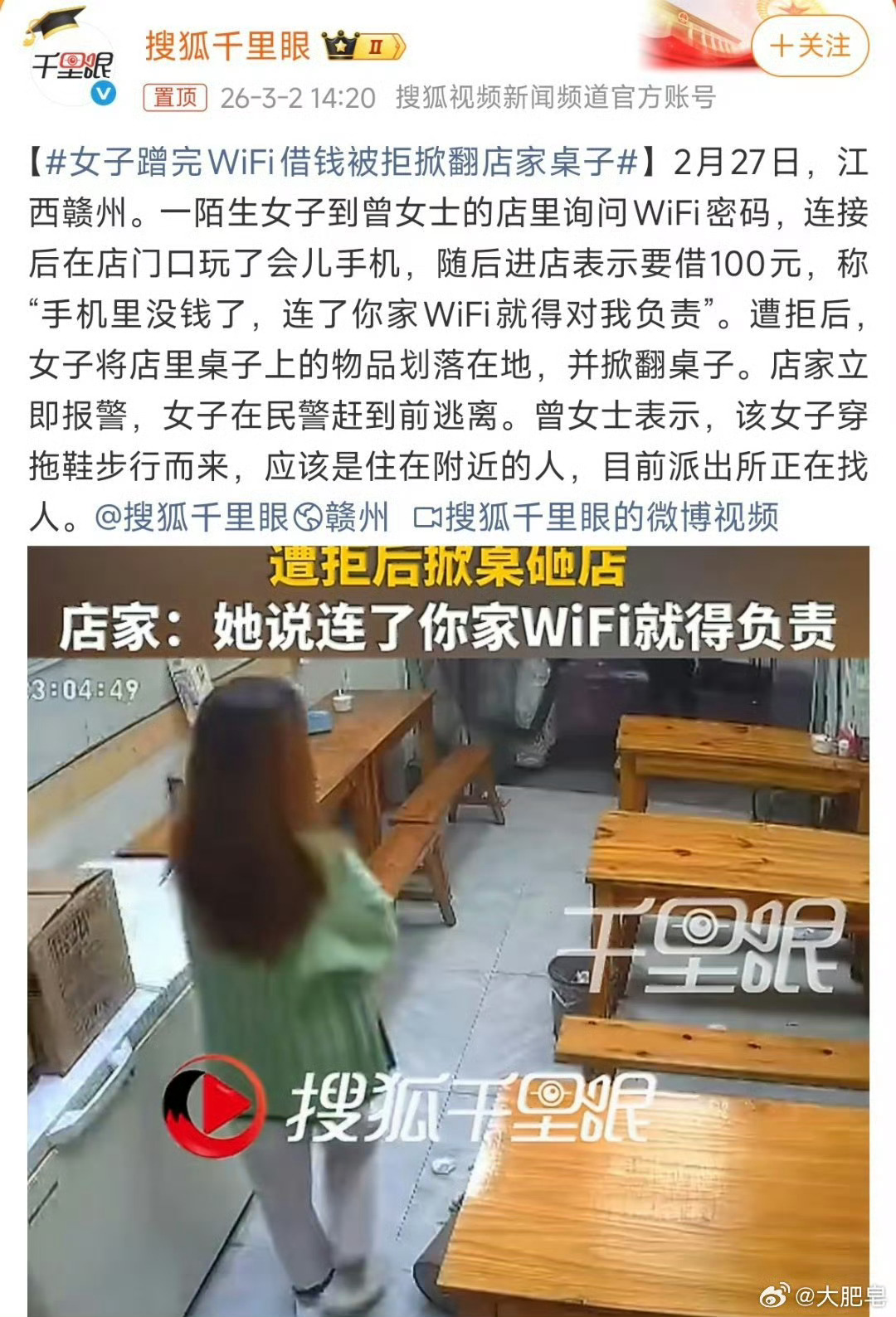 女子蹭完WiFi借钱被拒掀翻店家桌子