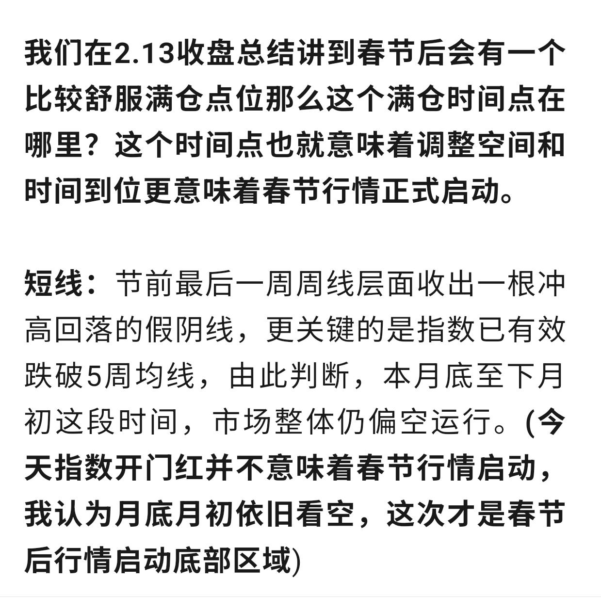 收盘总结:早盘开盘后指数迎来一波有力度反弹,但是日韩市场继续崩导致我们最终再次跌下来,中东事件日韩走势加剧本次调整 目前5月均线位置在3213点位这个位置非常关键不可以长期跌破。(11月曾短暂跌破后面当月收回后震荡企稳12月下旬再次走出一段上涨行情)中东事件叠加日韩崩盘这次调整力度再次砸破5月均线我们需要重点关注本月能否收回相当关键。(满仓依旧是风险) 2.14长篇文章从短线、中线、长线讲今年行情走势其中短线已经预判2月底3月月看空只提示不要满仓博弈没有再次降低仓位。(会议期间低估本次调整力度考虑会有维稳阶段)