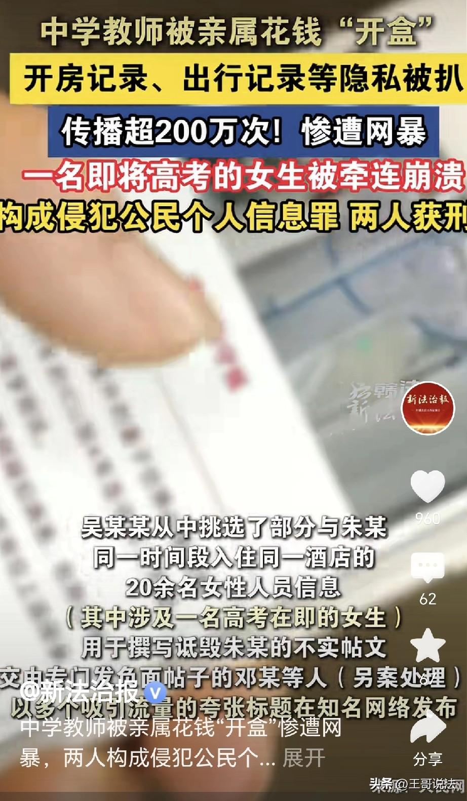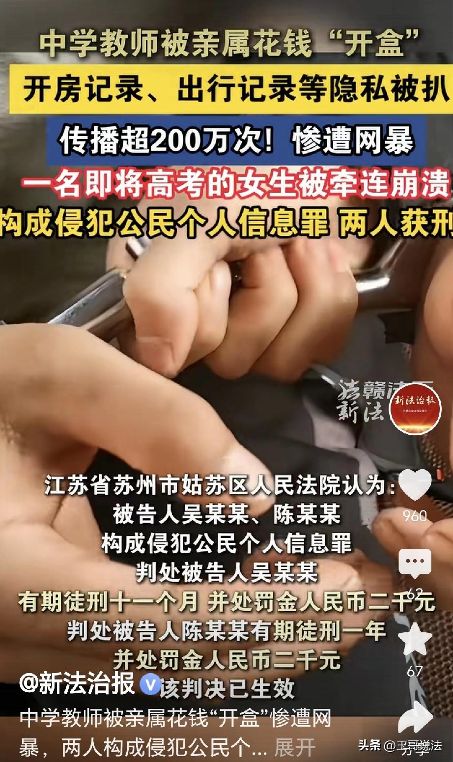 “太可怕了!”江苏,一男子是中学老师,因为和亲戚有矛盾,亲戚对他怀恨在心,亲戚为了报复,花13150块买到了男子住宿信息,并挑选同时段和男子住同酒店的女子信息,写成诋毁男子的帖子,用夸张标题在网上发布,帖子瞬间火了,被点赞转发200万次,男子被调查,一高三女学生也被牵扯进去,案件经过调查,法院判了! 朱某在学校里任职,他是一名中学老师,他兢兢业业,每天在学校里忙碌着教学。 吴某某和他是亲戚,俩人之间出现了问题,一次争吵,俩人言语不和,他们吵吵闹闹,互相的矛盾再次加深。 吴某某心里非常的生气,他无处宣泄,就和好友陈某某提起了此事。 陈某某对他多次劝慰,可是吴某某依旧对朱某怀恨在心。 一次两人聊天,吴某某又提起了此事,他越说越气,拿起一只杯子就摔在了地上。 陈某某一看他这个样子,知道他已经恨极了朱某,陈某某脑子一动,立刻想出来一个主意。 他告诉吴某某,不如搞到朱某的隐私给他散布出去,让他身败名裂,以解心头之恨! 吴某某一听,这是个好主意!他立刻行动,把朱某老婆的身份证号发给了陈某某,用来查询朱某的信息。 2020年5月,陈某某花13150元,从倒卖信息的陈某那里买了一批数据。 里面不仅有朱某的住宿和出行记录,还顺带买了陈某某的前女友杨某的个人信息。 这些信息足足有一千多条,里面还有很多与他们关联的其他人的信息。 陈某某挑出朱某的记录,一股脑发给了吴某某。 吴某某拿到记录,如获至宝,他高兴之余,想出来一个特别的主意。 他找出来和朱某同时段住同一家酒店的女子信息,他喜出望外,里面还有在中学读书的女学生20多人。 吴某某高兴至极,这可是难得的信息,他添油加醋,撰写了一些不实信息。 他写完之后,洋洋得意,立刻发给了陈某某进行修改整理。 陈某某把帖子改的更加夸张,吸人眼球,他找到专发负面帖子的邓某,将诋毁朱某的帖文,加上吸引人的标题,立刻在网络上发布了出去。 帖子瞬间引起了热议,人们不明真相,很短的时间,就被阅读,点赞,转发跟帖高达200万次。 没过多久,相关部门注意到了此事,立刻派人进校调查此事。 学生们也知道了消息,纷纷跑到老师那里询问此时,他们不敢相信,朱老师会做出这样的事! 其中一名高三女生就要高考,因为此事也被牵连了进去,可想而知,女生是多么的郁闷,她百口莫辩,每天以泪洗面,这根本就是莫须有的事情。 学校对女生进行了心理辅导,而朱某被传谣诋毁,工作和生活瞬间被困住。 人们对他指指点点,以为他是个道貌岸然的伪君子,朱某郁闷了,这是无妄之灾,他压根就没做过帖子里说的事情。 而另一边,陈某、汤某某和丁某某几人暗自高兴,发财的机会来了,他们趁着热度,开始倒卖朱某杨某的信息。 他们在朋友圈发布套餐,根据不同的信息,售价从8000多到19000元不等。 这些隐私信息瞬间火了,他们明目张胆,出售了高达1700多条。 经过调查,警方很快就锁定了目标,一鼓作气,把这个倒卖信息、网络造谣的团伙一锅端了。 《最高院、最高检察院关于办理侵犯公民个人信息刑事案件适用法律若干问题的解释》第5条第10项规定: 非法获取和出售公民个人信息,情节严重的,构成侵犯公民个人信息罪。 吴某某因为私人矛盾,花13150元买走朱某的出行住宿记录以及关联人员信息高达上千条。 他们拿到信息后,不是用来维权,而是专门挑女学生信息编造谣言,发到网上用来诋毁朱某。 帖子火了,传播量超过200万次,给朱某的工作名誉造成极大的打击,并且影响到即将高考的女学生,后果非常严重。 2021年2月1日,法院以侵犯公民个人信息罪判处吴某某有期徒刑11个月,罚款2000元;判处陈某某有期徒刑1年,罚款2000元。 其他人等另案处理。