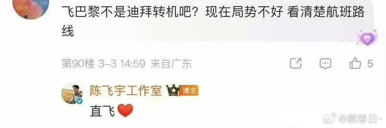 陈飞宇直飞巴黎陈飞宇工作室正式回应巴黎行程,本次时装周出行全程直飞,未安排转机路线,行程清晰透明,安心赴约❤️❤️❤️