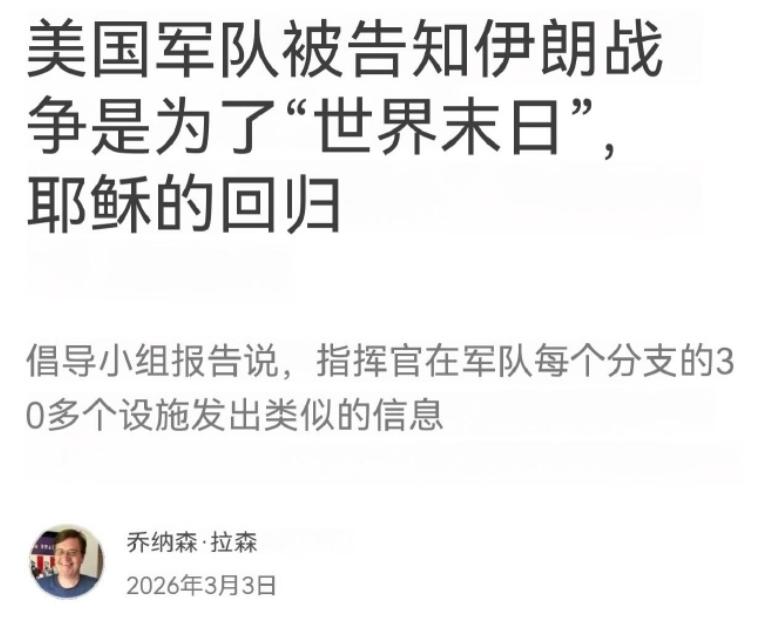 美军被洗脑:攻打伊朗是上帝旨意,为引发“末日之战”让耶稣降临 当地时间3月3日,据独立调查记者乔纳森·拉森爆料,美国“军事宗教自由基金会”近日接到了上百封来自美军士兵的投诉信,原因是一些美军部队的指挥官告诉士兵们,对伊朗开战是“上帝神圣计划的一部分”。 根据爆料内容,目前至少有30个美军基地出现了这种“洗脑”现象,涉事的指挥官层级不一,上到基地指挥官,下到基层小队负责人,都在向下级传递这种极端宗教思想。 他们给士兵们灌输的内容很具体,宣称特朗普是“耶稣钦点”的总统,之所以这么说,大概率和特朗普此前遭遇刺杀却侥幸幸存有关,指挥官们借此渲染,说特朗普是受到了“膏立”的“神使”,是上帝派来拯救美国、完成神圣使命的。 更离谱的是,这些指挥官还告诉士兵,特朗普下令攻打伊朗,根本不是出于地缘政治或者能源利益的考虑,而是严格遵循“上帝的旨意”,目的就是要主动引发最后的“末日之战”,只有这场战争打完,耶稣才会降临人间,拯救人类。 这种听起来荒诞不经的言论,居然被当成“真理”,一遍遍灌输给本该坚守军事职责的美军士兵,不少士兵表示,自己被这种言论困扰,甚至开始怀疑这场战争的意义,还有人担心,长期被洗脑会影响自己的判断,甚至做出极端行为。 其实仔细想想,这种现象也不是突然出现的,美国军队里的宗教渗透早就有迹可循。早在2014年,美国空军就曾出现过强制军士对上帝宣誓的事情。 一名内华达州克里奇空军基地的技术军士,因为是无神论者,拒绝对上帝宣誓“愿上帝助我”,就被空军驳回了延长服役的申请,这名军士无奈之下只能准备将空军告上法庭。 要知道,美国宪法明确禁止对公职人员进行宗教考验,而美国空军也是当时唯一一个要求所有官兵在所有情况下使用宗教语言的军种。 而特朗普被支持者包装成“上帝派来的人”,也不是第一次了。早在2020年,就有特朗普的铁杆支持者公开表示,自己坚信特朗普是上帝派来的。 哪怕特朗普不完美、是个罪人,就像《圣经》里的摩西和大卫一样,依然是上帝选中的人,当时特朗普还特意转发了相关报道,连用三个感叹号表示感谢,变相认可了这种说法。 如今,这种说法被美军指挥官拿来利用,包装成“耶稣钦点的神使”,无非是想给攻打伊朗找一个更“正当”的借口,让士兵们心甘情愿地奔赴战场。 美国国防部长赫格塞斯,也一直有着浓厚的宗教倾向,他曾多次在公开场合敬拜耶稣,甚至在五角大楼里主持过基督教祈祷仪式,这种公开将宗教与军事绑定的行为,无疑也给美军内部的宗教渗透开了绿灯。 要知道,美军作为一支国家军队,本该服务于国家和人民,坚守军事职责,可现在,宗教思想却在军队里大肆蔓延,指挥官用宗教言论洗脑士兵,让士兵们把宗教信仰凌驾于军事使命之上。 这些被洗脑的美军士兵,不少人已经陷入了迷茫,有士兵在投诉信里表示,自己参军是为了保卫国家,可现在却被要求为“上帝的旨意”而战,甚至要为了引发“末日之战”去牺牲,这让他们无法接受。 还有士兵透露,一些拒绝接受这种洗脑言论的人,会被指挥官区别对待,要么被安排到危险的岗位,要么受到排挤,不少人敢怒不敢言。 美国“军事宗教自由基金会”已经针对这些投诉展开调查,该基金会的负责人表示,美军内部的这种宗教渗透,严重违反了美国的宪法精神,也破坏了军队的中立性和专业性,必须严肃处理。 目前,该基金会已经将相关投诉整理成册,提交给了美国国防部,要求国防部介入调查,叫停这种“洗脑”行为,保障士兵的宗教信仰自由,同时规范指挥官的言行,杜绝宗教思想干预军事行动。 随着这件事被曝光,越来越多的人开始质疑,如今的美国军队到底服务于谁?是服务于美国这个国家,还是服务于宗教势力,服务于某些人的政治野心? 毕竟,一支被宗教思想洗脑、将“末日之战”当作作战目标的军队,不仅会给自身带来隐患,更会给中东地区带来更多的动荡和灾难,而这一切,都值得全世界警惕。