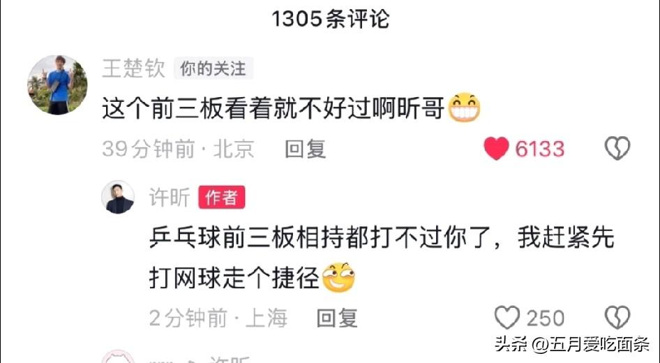 许昕秀自己打网球,王楚钦想参与,被婉拒。[笑哭][笑哭][笑哭][笑哭][笑哭] 现在马龙、闫安、许昕、丁宁都在学网球,留下的弟弟妹妹们都在苦哈哈练乒乓球,心痒太正常了。 怕就怕,不止是洛杉矶,还要布里斯班[笑哭][笑哭][笑哭][笑哭][笑哭]