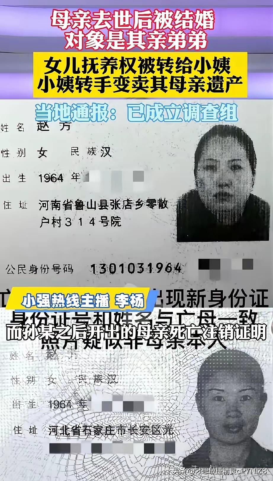 这是要吃绝户!河南平顶山,母亲去世后,9岁女儿的抚养权被转给小姨。10年后,女子得知母亲有房产和商户等,希望继承母亲遗产。谁知,办理手续时竟发现,母亲去世第二年,竟然被结婚,结婚对象是自己的亲舅舅,户口也没有被注销,变成了舅妈的脸。更可恶的是,母亲去世才14天,小姨就顺手变卖了母亲留下的房产。网友惊呼:这是真正的吃绝户呀! 旧社会的“吃绝户”,是欺负孤弱的陋俗,本应被法治社会彻底抛弃。 可这起事件里,亲人联手设局,把孤女的权益踩在脚下,比旧俗更让人寒心。 9岁的孩子没了母亲,本该被呵护,却成了亲戚觊觎遗产的目标。 小姨手握监护权,本该守好孩子的身家,却在母亲离世14天就急着卖房。 伪造委托书、私自处置遗产,每一步都在践踏监护职责,也无视法律底线。 所谓的亲情,在贪婪面前,变得一文不值。 更荒唐的是,逝者竟被和亲舅舅登记结婚,照片还是舅妈冒名顶替。 近亲本就禁止结婚,更何况一方早已离世,这场登记从根上就是违法无效的。 违规迁户、伪造身份、隐瞒死亡事实,环环相扣的操作,全是为了侵吞遗产。 《民法典》明确规定,监护人只能为被监护人利益处分财产,绝不能监守自盗。 这些人利用制度漏洞,用虚假手段剥夺孩子的继承权,已然触碰法律红线。 从伪造证件到非法处置房产,每一项行为,都要承担相应的法律责任。 如今当地已成立联合调查组,彻查违规登记、户籍迁移、财产处置的全流程。 正义或许会迟到,但绝不会缺席,违法者终究要为自己的贪婪付出代价。 被侵占的遗产,理应悉数返还,给这个苦了十年的女孩一个公道。 亲情最珍贵的是守护,不是算计;监护权是责任,不是掠夺的工具。 现代法治社会,容不下“吃绝户”的龌龊行径,更不会让孤弱之人无处申诉。 守住法律底线,护住弱者权益,才是社会该有的温度。 各位读者你们怎么看?欢迎在评论区讨论。
