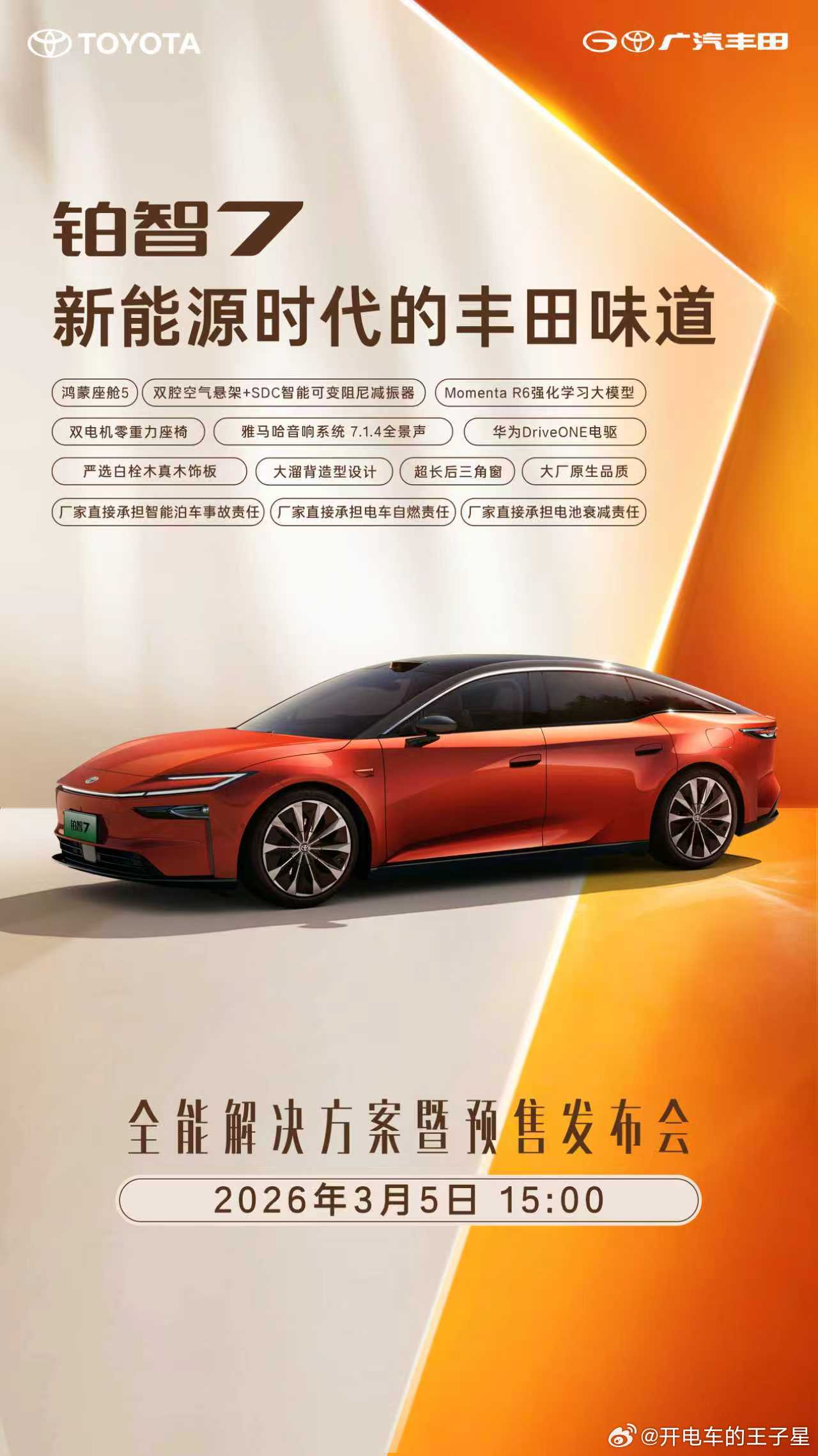 而以上这些,只是预售前对外可见的还有更多的是明天才发布的把百年造车的务实与靠谱融入到智能电车的每一处细节给用户长期确定性如果说新能源的特色是不断的推陈出新那这台丰田铂智7给到的 就是那种让你跨越时间的安心让消费者记住豪华行政的感觉铂智7定档3月5日预售发布大v聊车我和汽车的日常