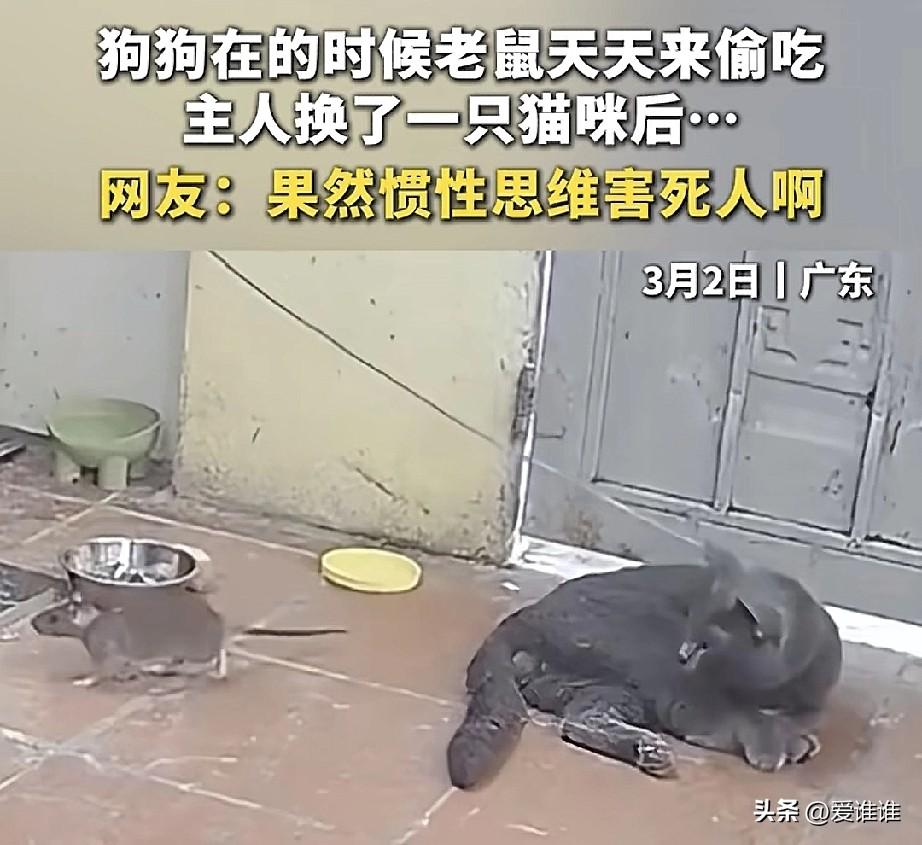 “上当了吧!”男子家里开始养了只狗看家护院,一只老鼠经常来光顾,偷吃家里的东西,有时候甚至明目张胆的吃狗的食物,那只狗对老鼠也是爱搭不理,后来狗被送人,男子又养了一直猫,没想到老鼠又来光顾,这次被这只猫一爪拍下去丧了命!网友都说:“惯性思维果然害人啊!”