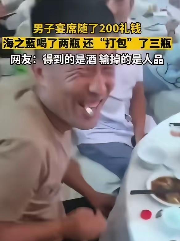 “人不要脸,天下无敌!”2023年,河北一男子去喝喜酒,只封了200块红包,却一人在席上喝掉2瓶海之蓝,还趁着没人注意,在桌布下偷偷拿了3瓶海之蓝灌进雪碧瓶里,生怕别人看到丢脸。 说实话,这年头参加婚礼,200块的份子钱也就是个意思,图个喜庆热闹。可河北这场婚宴上,有人硬是把这200块玩成了一场"套利游戏",而且还玩得明目张胆! 事情发生在2023年,当时这名男子在签到台上刷刷写下"200元",墨迹还没干透,他心里的小算盘就已经噼里啪啦打起来了。转身进宴会厅,这哥们儿压根没打算跟人寒暄客套,眼神直勾勾地扫过餐桌,最后锁定了目标——成箱堆在脚边的海之蓝。 主家为了撑场面,酒水可没少备。可谁能想到,这些本该用来助兴的白酒,在某些人眼里就是行走的人民币啊! 酒瓶开启的声音混在嘈杂的人群里,这男子几乎筷子都没怎么动,全程就盯着杯子。喝酒的速度快得吓人,那架势不像是在喝喜酒,倒像是在赶KPI!第一瓶见底,紧接着第二瓶,同桌的亲戚都看傻眼了,面面相觑之后默默挪开椅子,跟他拉开距离。 但人家根本不在乎这些异样的眼光。两瓶下肚,眼底泛起的红晕反倒给了他更大的胆子。 真正的"好戏"在婚礼最高潮时上演了。当所有人的注意力都被舞台上的新人吸引,举着手机记录幸福瞬间的时候,这哥们儿的手伸向了随身带的空雪碧瓶。看这架势,这瓶子显然是提前准备好的"作案工具"! 他假装低头系鞋带,手却在桌布下面灵活穿梭。三瓶未开封的海之蓝,就这么神不知鬼不觉地被他摸到了膝盖位置。 动作极其细碎,还特别有节奏感——拧开瓶盖,让白酒顺着雪碧瓶的内壁缓缓滑下,不带起一丝水声。每隔几秒,他还会像做贼心虚似的抬头环视,确认周围没人注意到这个角落。 这种操作简直荒诞到极点:他明知道这事儿丢人,所以用雪碧瓶来掩饰。但他又控制不住自己的贪欲,硬是把"知耻"和"无耻"完美缝合在了一起。三瓶灌装完毕,甚至还细心地擦干了溅出的酒渍,生怕留下什么蛛丝马迹。 当他拎着装满"战利品"的包,淡定地跟主家道别离开时,那200块的份子钱早就被他喝回本了。按照当时的市场价,他不仅回本,还净赚了至少300块的差价!这笔账,他算得门儿清。 这原本可能是一桩能带进坟墓的秘密。可惜啊,2023年7月17日,这段画面被北青视频的镜头完完整整地记录了下来。社交媒体的判决从不迟到,网友给出的定论极其刻薄且精准:得了几瓶酒,输掉一辈子的人品! 到了今天,2026年了,这桩旧闻依然被翻出来当作份子钱文化里某种扭曲的标本。他精心计算了酒水的价格,计算了被发现的概率,唯独漏算了这个时代无处不在的摄像头和手机镜头。 桌布下的秘密早就不是秘密了。那个沉甸甸的包,最后装下的只有足以伴随他一生的社交污点。这种拿脸面当质押的"薅羊毛"行为,代价贵得离谱!说白了,为了几百块钱的蝇头小利,把自己的人品彻底败光,这买卖怎么算都不划算。 别以为占了小便宜就是赢家,在这个到处都是眼睛的时代,你的每一个小动作都可能被放大成笑话。这哥们儿用亲身经历告诉我们:有些便宜,真的占不得! 参考信息:北青视频.(2023-07-17).男子吃席随礼两百,喝了两瓶海之蓝并打包三瓶,网友:得了酒输了人品
