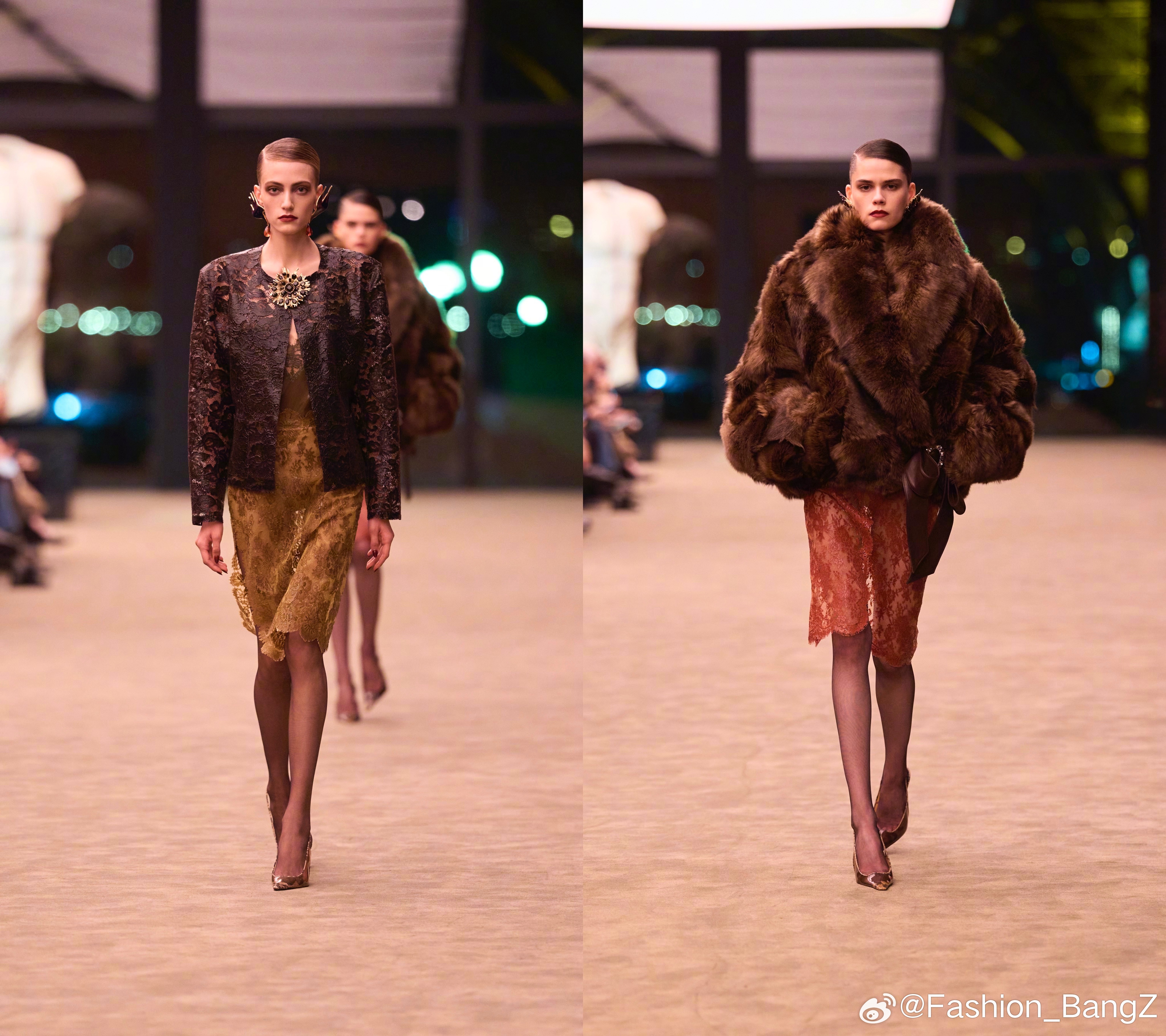 材质上反转传统,硅涂层轻薄蕾丝挺括有型,西装柔润,羊剪绒外套打造舒适包裹感;色彩以纯黑为底,搭配赭石、青绿等油画色调,金色鸽形珠宝点睛。秀场打造极简现代主义私密寓所,复刻 Yves Saint Laurent 先生私宅雕像,亦即品牌永恒的故乡。