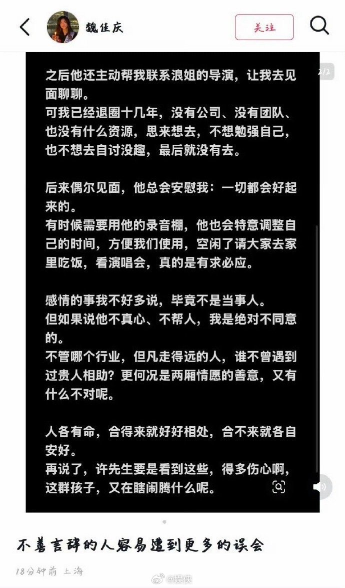 魏佳庆为张杰发声 魏佳庆长文力证张杰人品,低调内敛却重情重义。不仅热心帮忙对接浪姐导演,还大方出借录音棚,对朋友始终有求必应,多年情谊不变,遇事依旧彼此撑腰,用行动诠释什么是真正的好人品!魏佳庆不善言辞的人容易遭到更多误会
