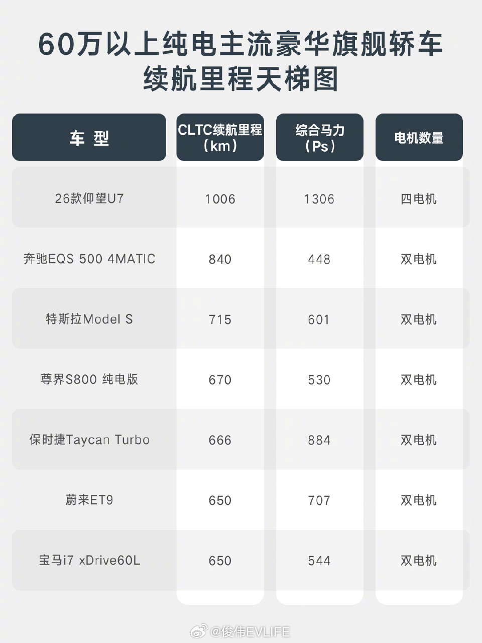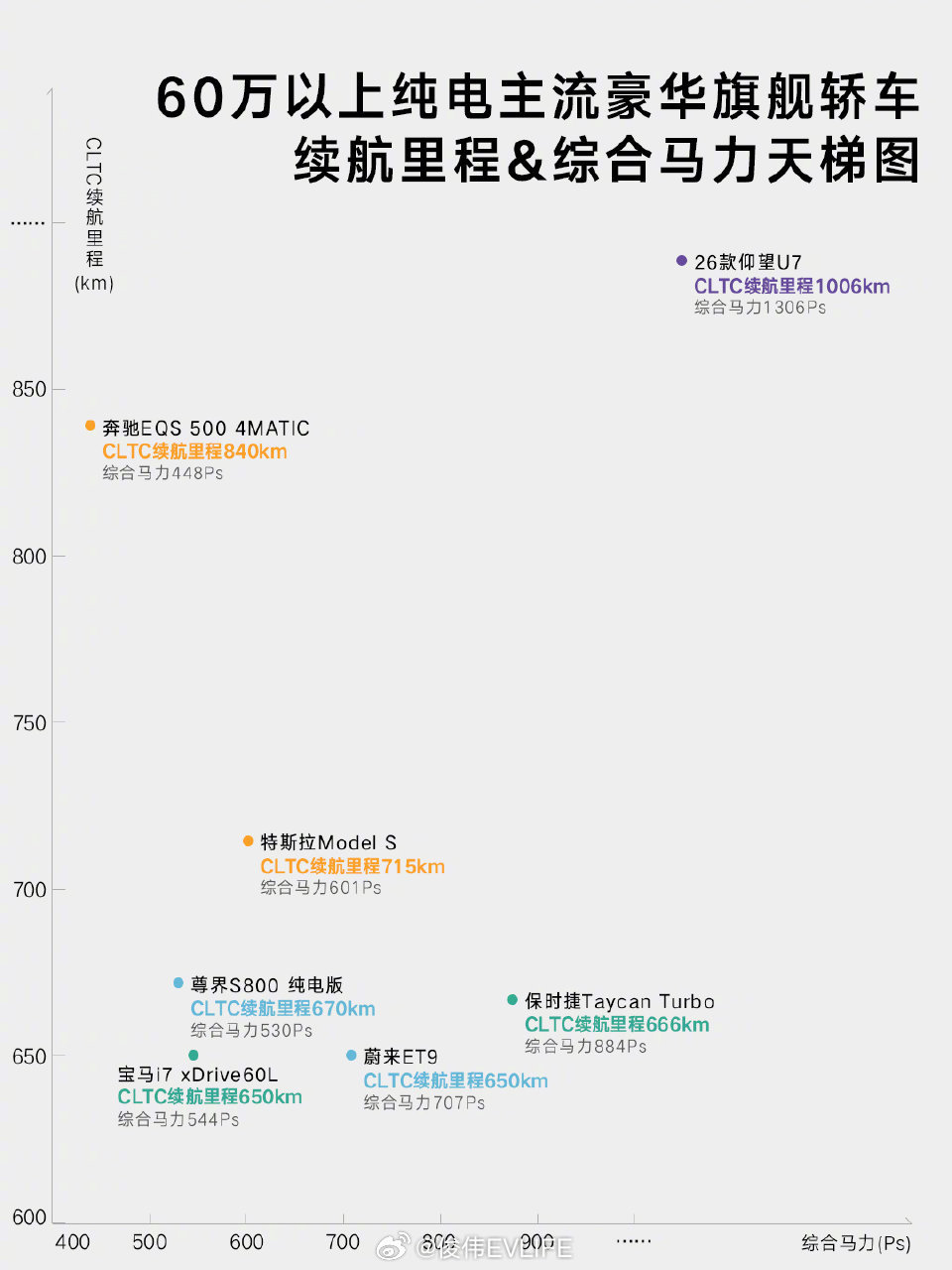 仰望U7这次的双千组合,1006km纯电续航,让纯电车正式迈入千公里时代,1300+马力,四电机960kW满功率,目前也唯有U7能做到"双千"兼得。