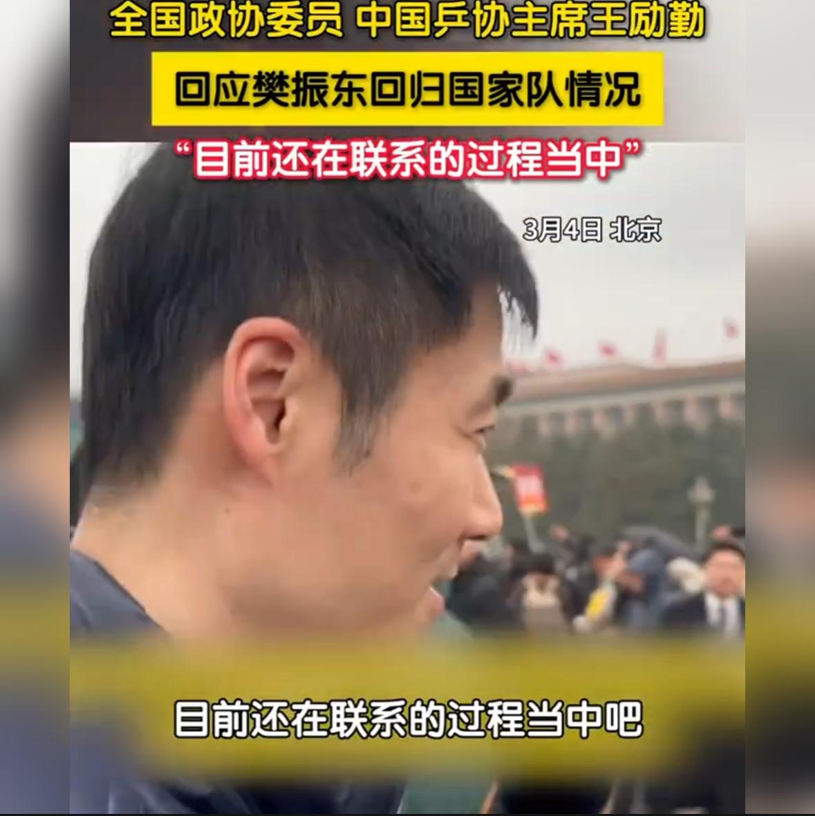 樊振东回归最新消息来了, 3月4日,在北京参加两会的乒协主席王励勤,在参会现场路上期间,匆忙回应记者简短询问时表示:关于樊振东回归国家队情况,目前还在联系的过程当中。 记者:樊振东何时回归国家队? 王励勤:目前还在联系的过程当中吧! 记者:还在联系。 王励勤:对! 从王励勤回答的言语之间,我们不难发现,关于樊振东回归的事情,王励勤已经有所动作,至于何时回归,应该只是时间问题,毕竟在德甲比赛的樊振东,还要兼顾德甲联赛以及是否续约的事情。 关于樊振东回归的事情,已经很久没有音信了,这次能够从王励勤口中得到“在联系”的消息,已经是一个非常好的开始了。 毕竟,洛杉矶奥运会上,看到樊振东的身影,是很多人一直以来,非常期待的事情。期待,小胖能够回归自然希望,美好能够如约而至!