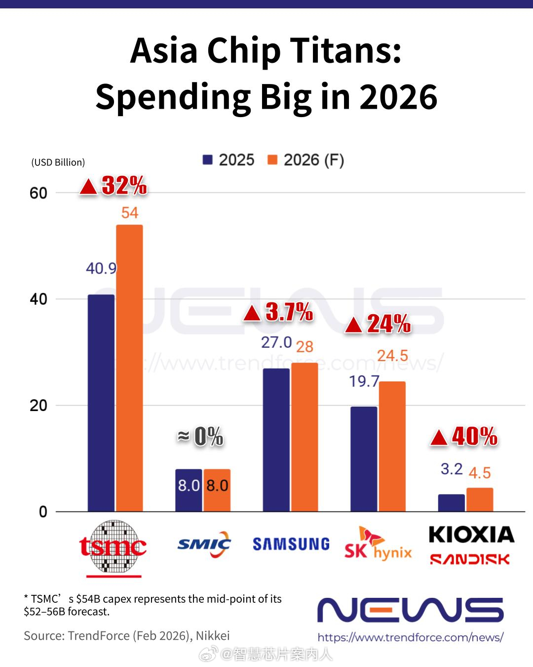 TrendForce报道,2026年亚洲头部Foundry和IDM的的资本开支合计的同比增长25%。